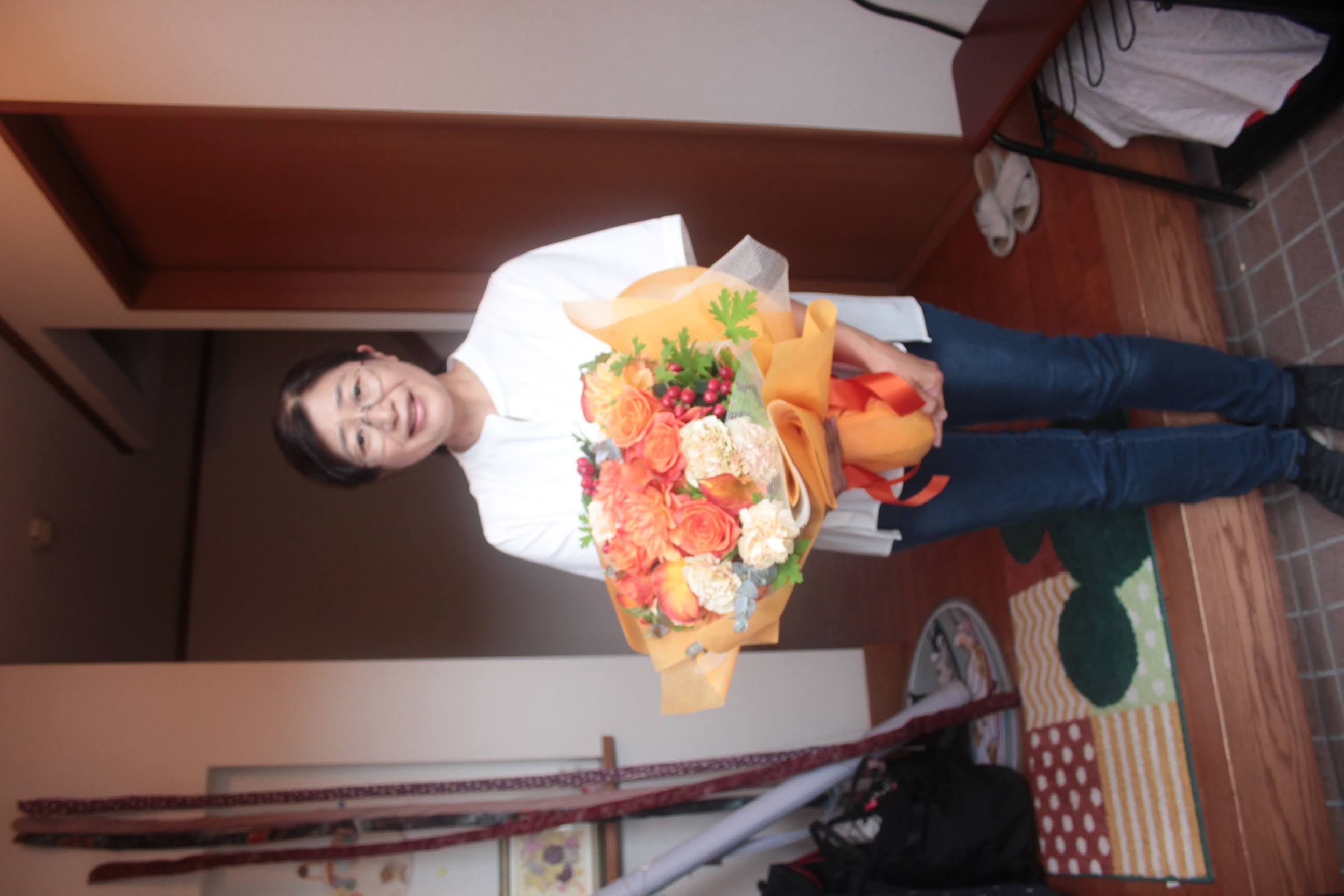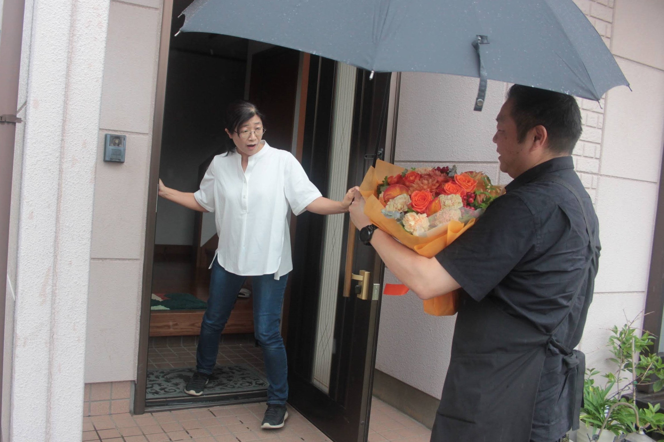 土屋太鳳さんデザインの花束とサイン入りポスターを受け取ったお母様は「娘とキャンペーンの写真を見て、素敵なデザインの花束で、これが欲しいと話していました。すごい!写真のとおりですね」と花束のご感想を、そして、ポスターをじっと見つめると「太鳳ちゃんの字ですね」とおっしゃり、「ほんとにありがとうございます」と涙を流して感激されていました。