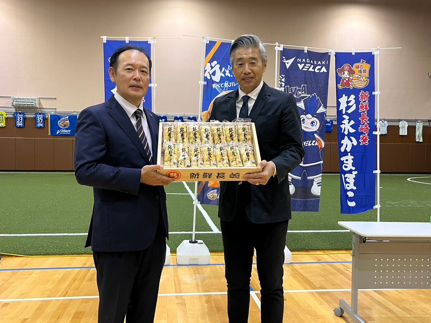 株式会社V・ファーレン長崎(本社:⻑崎県諫早市/代表取締役会長 兼 社長:髙田 旭人)と株式会社長崎ヴェルカ(本社:長崎県長崎市/代表取締役社長 兼 ゼネラルマネジャー:伊藤拓摩)は、V・ファーレン長崎アカデミーサポーター、長崎ヴェルカシルバーパートナーの株式会社杉永蒲鉾様(本社:長崎市幸町、代表取締役社長:杉永清悟)より12月11日(月)にV・ファーレン長崎と長崎ヴェルカスクール生へ、低脂肪・高タンパクのフィッシュプロテイン商品「純生ちくわ」を贈呈いただきましたのでお知らせいたします。