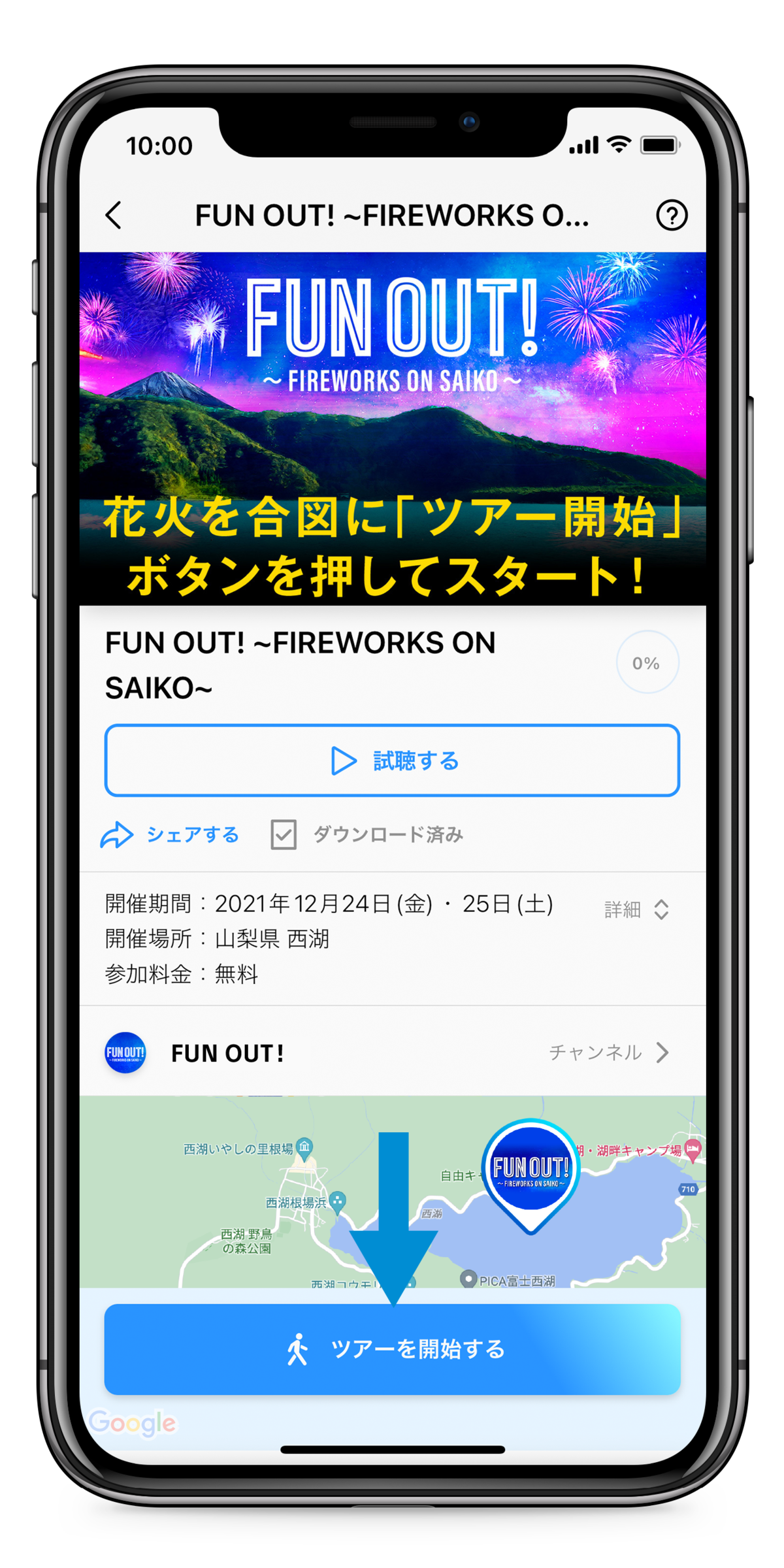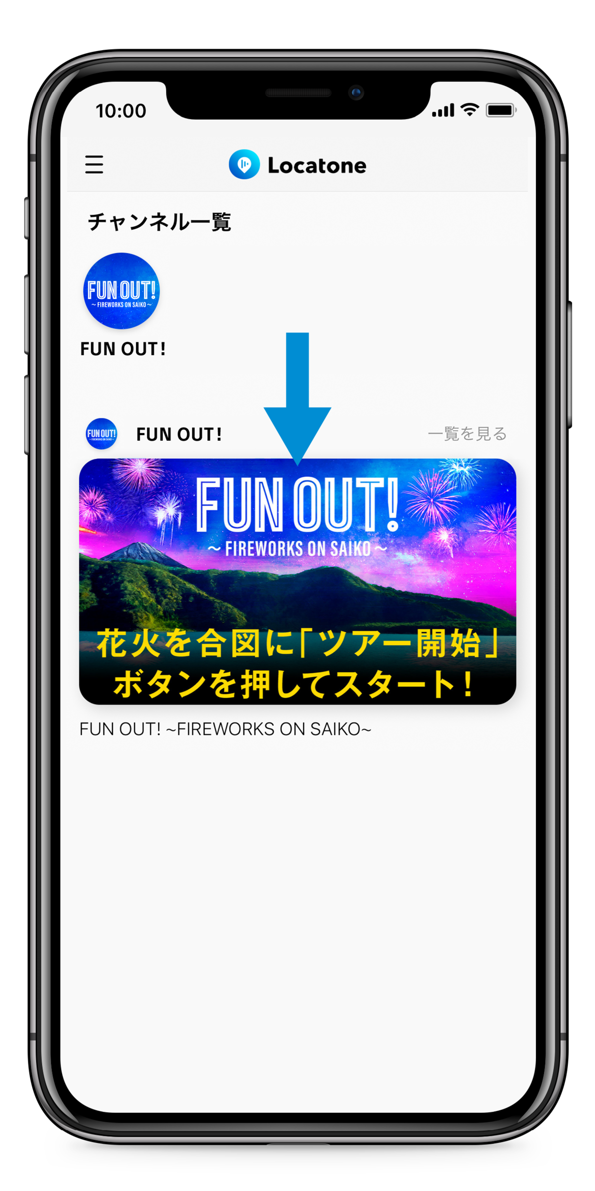 ・スマートフォンアプリ「Locatone」を起動し、トップページから「FUN OUT!」のツアーを選択。