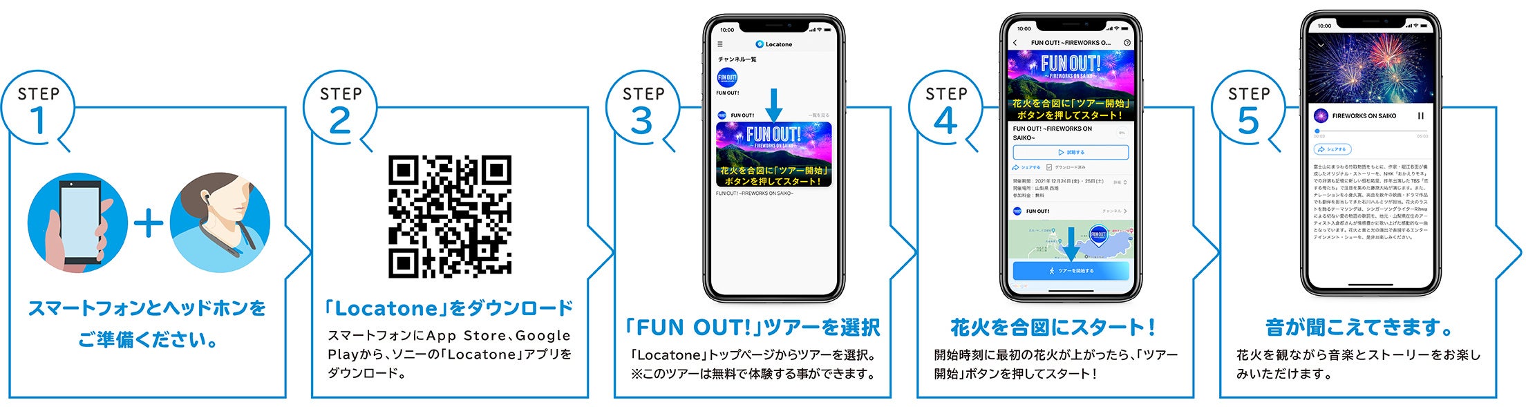 株式会社ソニー・ミュージックソリューションズ(本社:東京都港区、代表取締役:志田忠彦、渋谷学)は、12月24日(金)、25日(土)に富士山の裾野・西湖で開催されるイベント「FUN OUT! ~ FIREWORKS ON SAIKO ~」のメインとなる花火ショーにおいて、地元の皆さまにより多く楽しんでいただくために、ソニーが提供するスマートフォンアプリ「Locatone(ロケトーン)」を使い、メイン会場にいない方でも音楽とストーリーをお楽しみいただけるコンテンツを無料で提供することを決定いたしました。