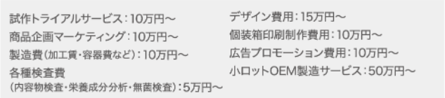 - 各種検査費用(内容物検査・栄養成分分析・無菌検査):5万円〜