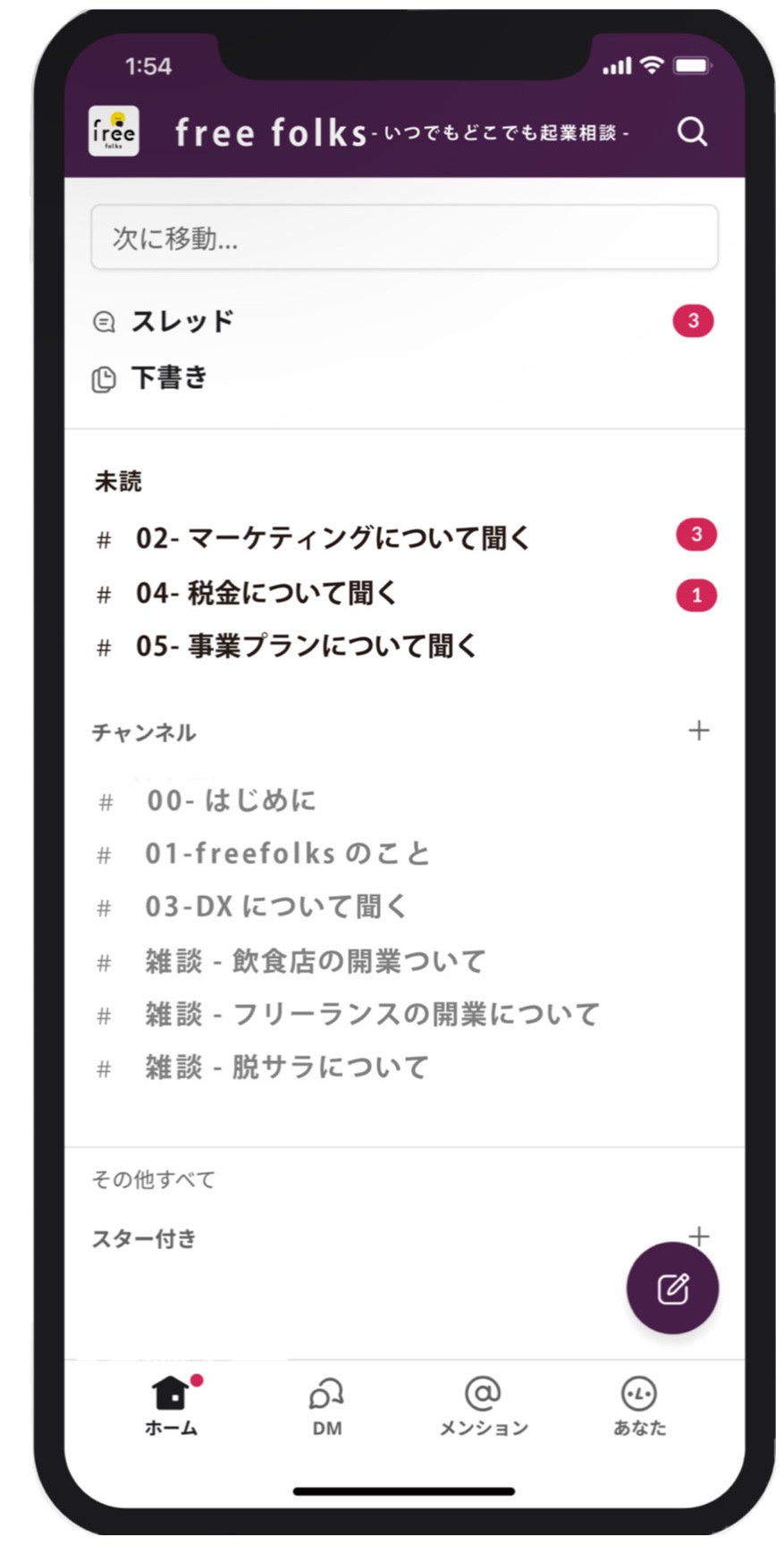 チャットツール「Slack」を使用し、いつでもどこからでもご相談を受け付けます。「事業を具体化する」という第一ステージから、お悩み相談、実務相談、事業アクションの具体化などを行い起業への第一歩目をサポートいたします。
