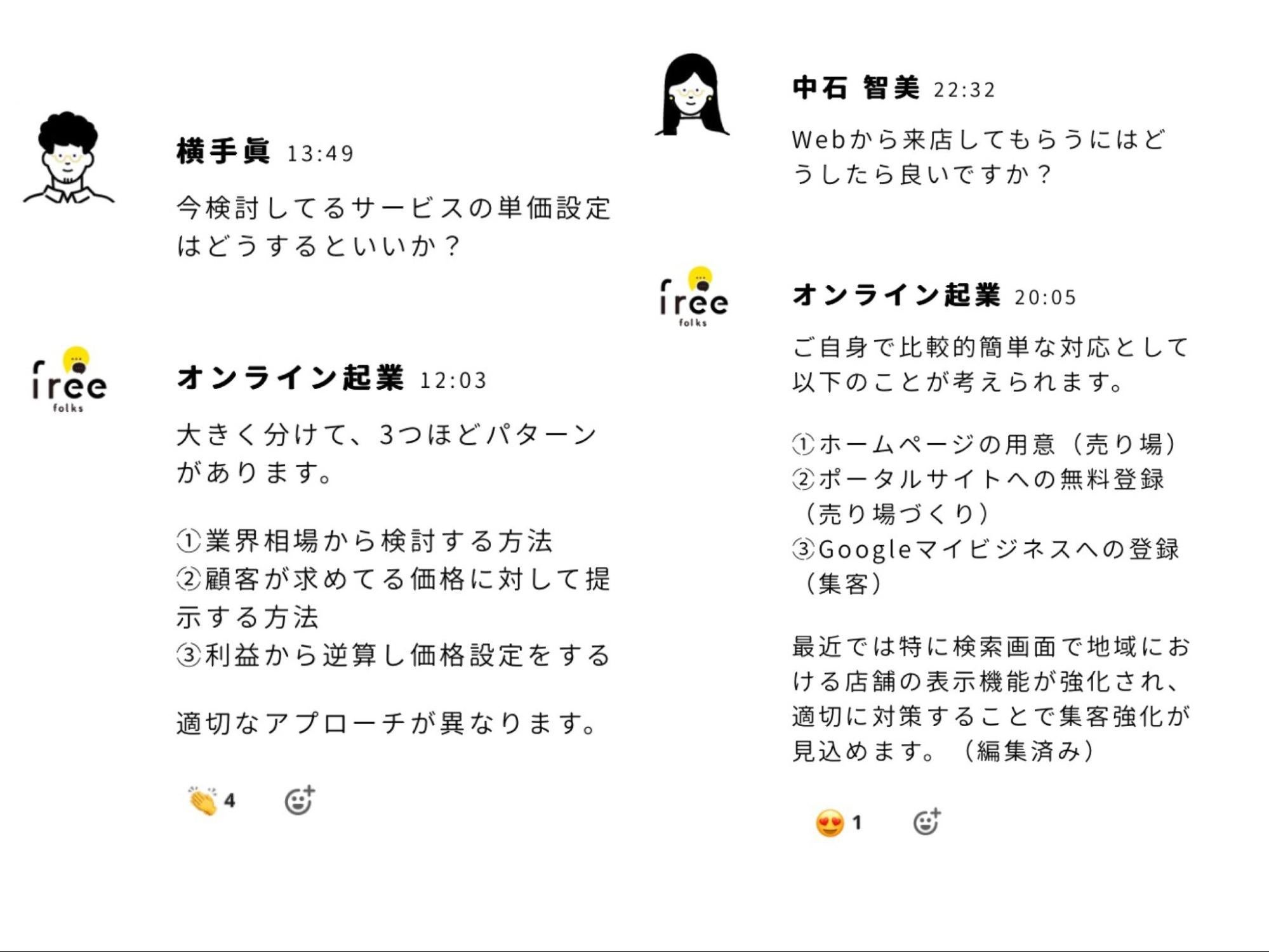 起業においては、複雑な課題が様々なフェーズで発生する為、アイデア創りから、具体的な実務面の課題、バックオフィスまでをサポート出来る体制が必要となる為、現場のエキスパートがチャットでお答えするという形で実現致しました。