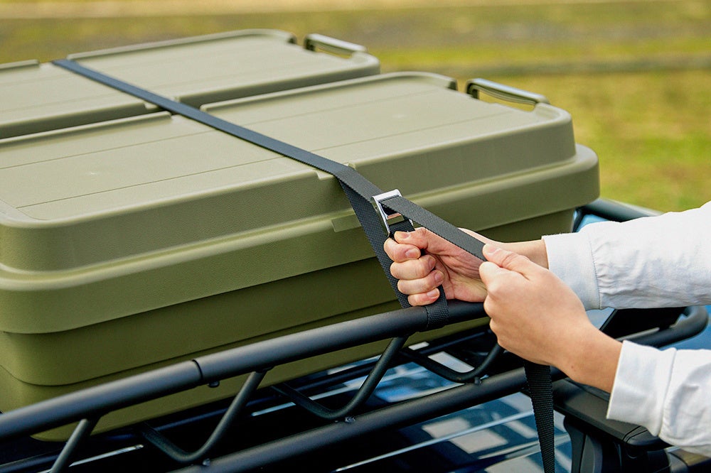 長辺・短辺にベルトガイドがついており、向きを選ばずにベルトで固定することができます。車のルーフラックに積載する際などにしっかりと固定できます。