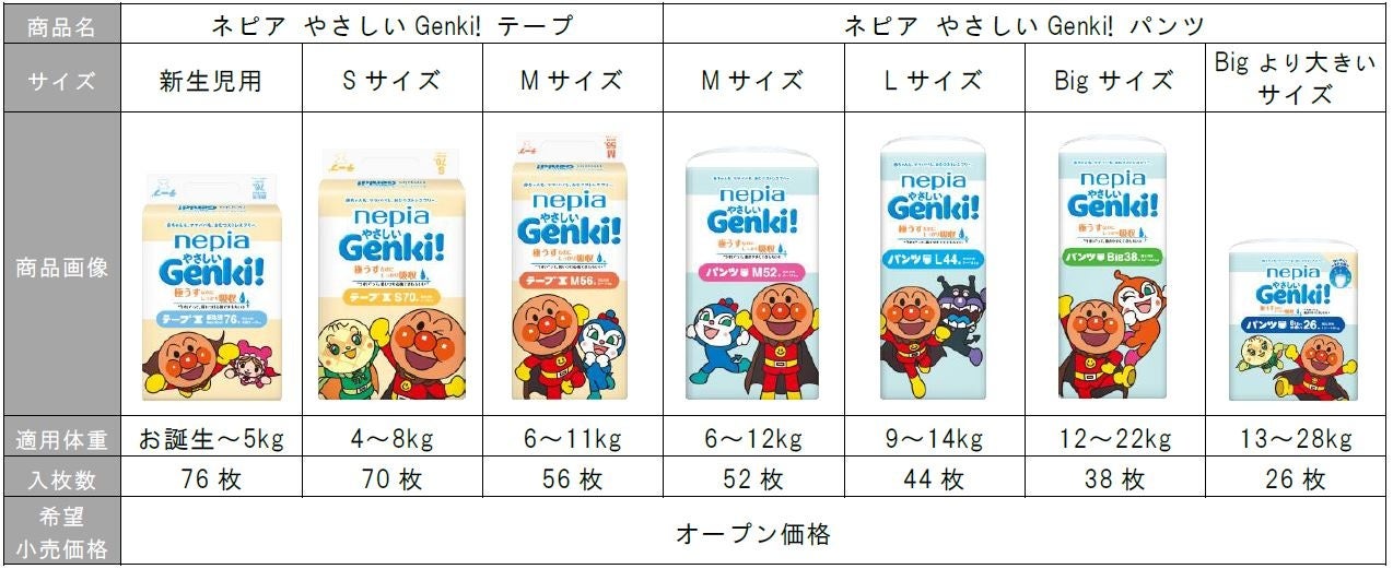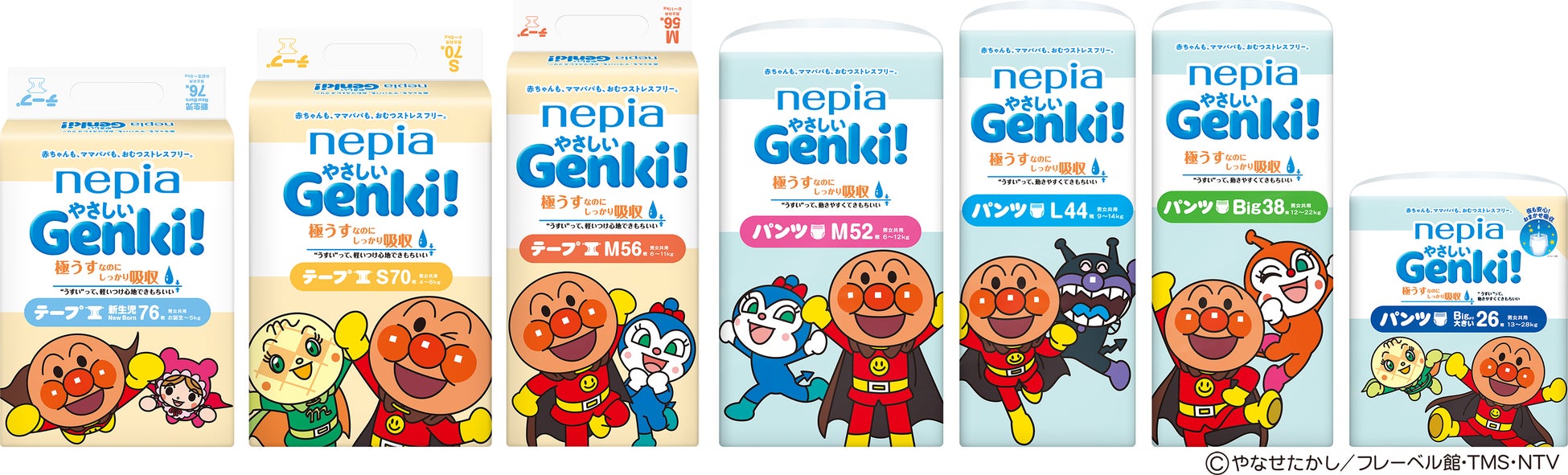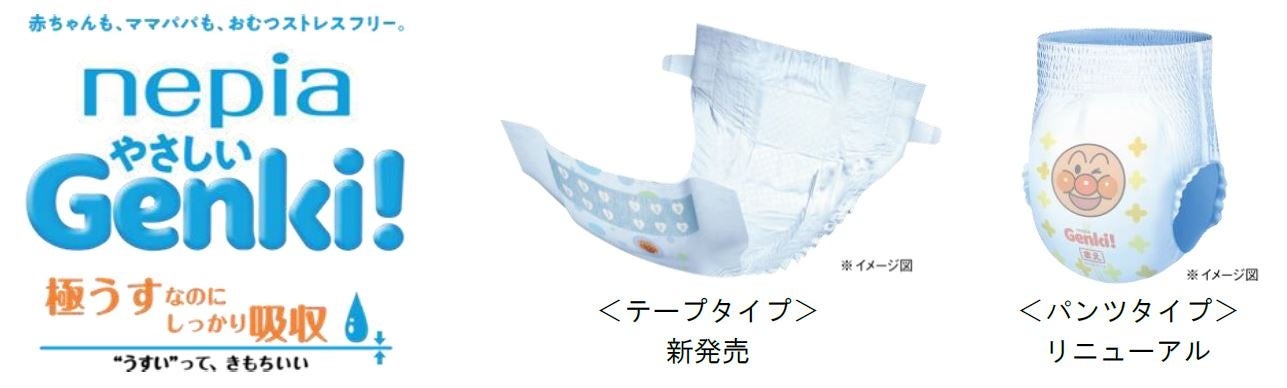 「赤ちゃんも、ママパパも、おむつストレスフリー」を目指す『ネピア Genki!』は、この度、赤ちゃんの快適さをさらに追求し、新採用の「うすくてもおしっこをしっかり吸収する“極うす吸収体”」によっておむつの厚みを従来品比約「25%」削減(※1)し、成長して活動的になるパンツタイプ世代の赤ちゃんに、うすいおむつの動きやすい心地良さを提供します。加えて、このうすくて軽いつけ心地を繊細な低月齢の赤ちゃんにもお届けするため、新たにテープタイプも発売し、新生児からおむつを卒業するお子さん迄、幅広いおむつ世代に「極うすの快適さ」を提供します。