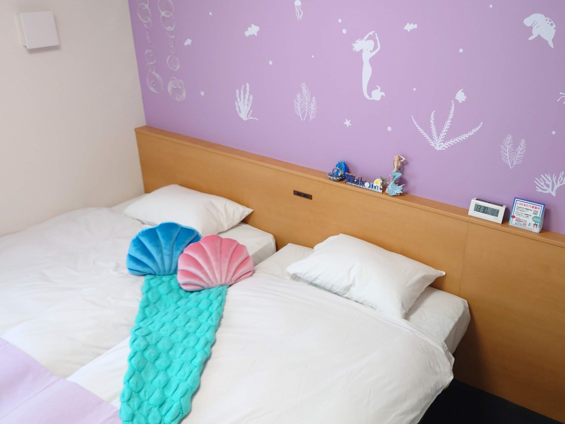 海の中をイメージしたアイテムで楽しく滞在!部屋の隅々までプリンセスの世界を表現しています。女性のグループ利用はもちろん、ご家族での利用にもおすすめです。シングルベッド2台を隙間なく並べ、幅200㎝の幅広ベッドとして設置しています。