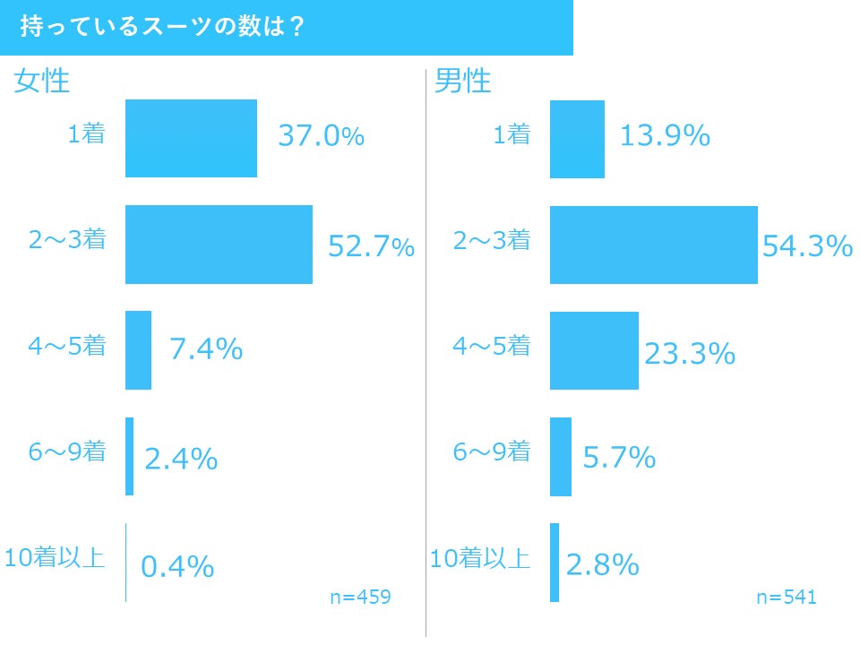 ただし、2番目に多い回答は、女性が1着(37.0%)、男性が4~5着(23.3%)と男性の方がスーツを多く持っている傾向があらわれました。