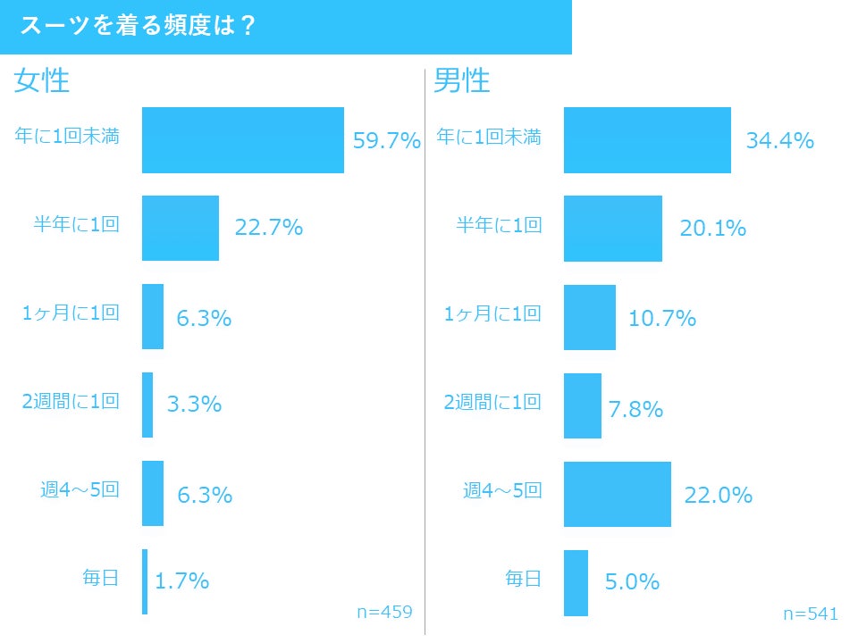 スーツを着る頻度は男女とも年に1回未満が最多(女性:59.7%、男性34.4%)