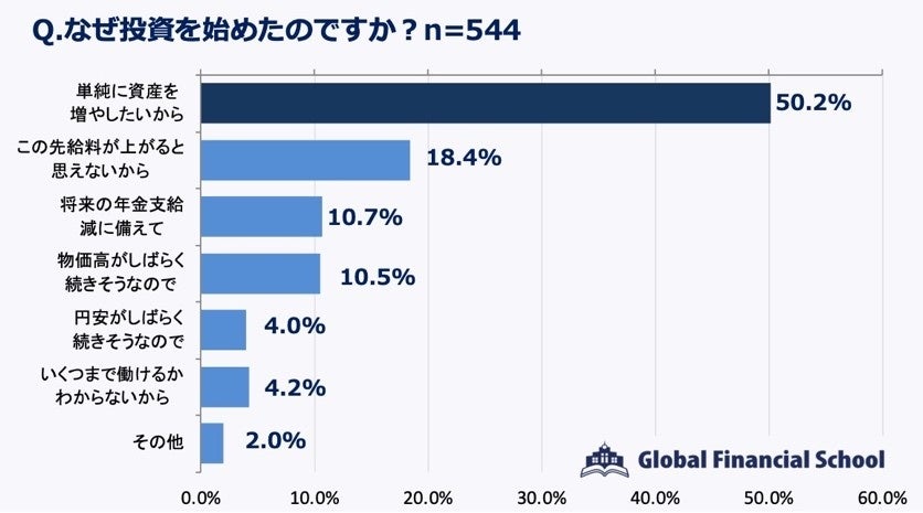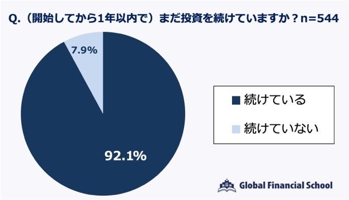 業界最多の講座数を誇る日本最大規模の金融オンラインスクール「グローバルファイナンシャルスクール」(以下略:GFS、東京都港区、市川雄一郎校長)は、この 1 年以内に投資を始めた全国 20 代〜60 代の男女 544 人に対してアンケートを行いました。