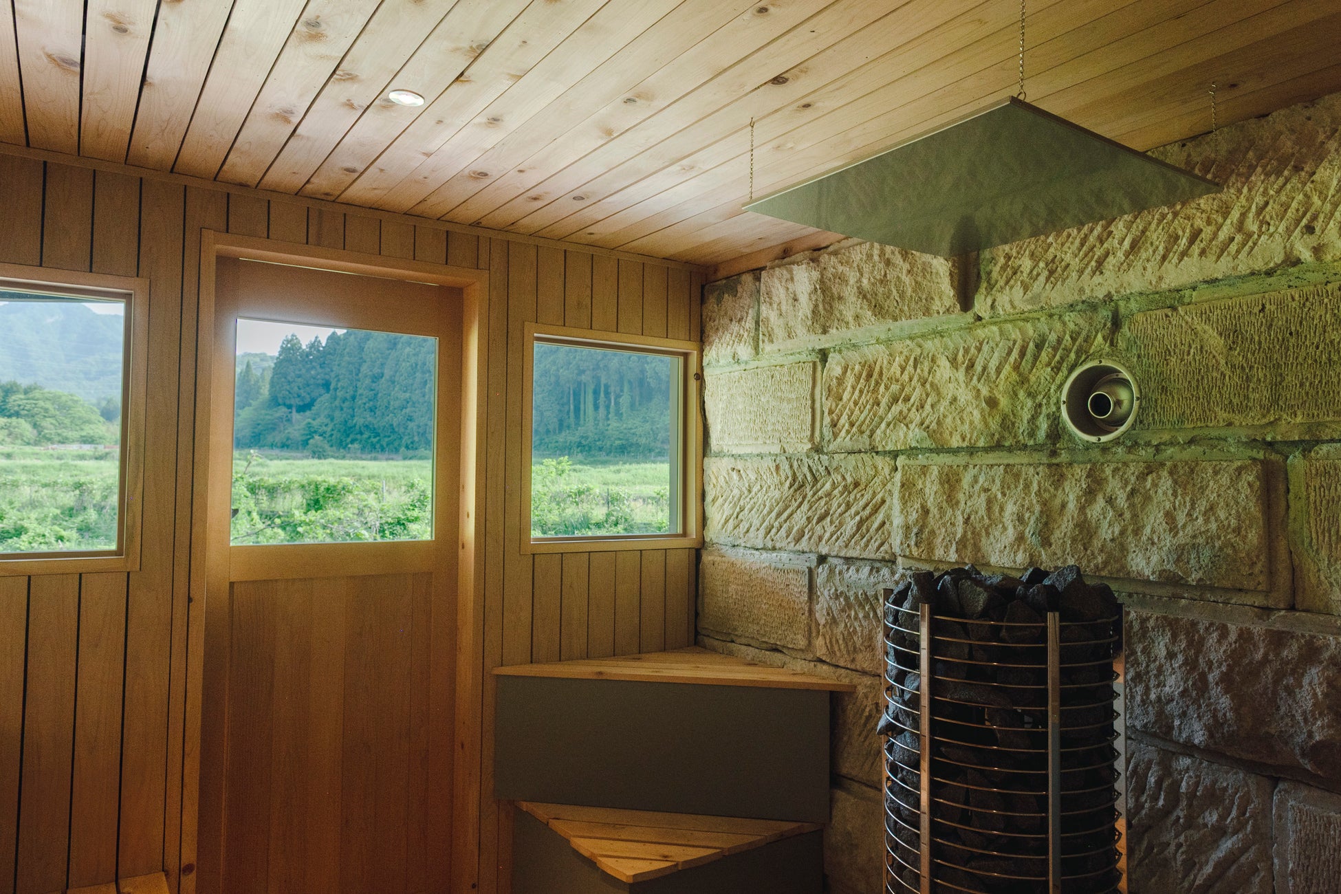 サウナ室には石川県産ヒバ、滝ヶ原石を使用。自然の息吹を感じる静かな空間が、深いリラックスへと導きます。 -