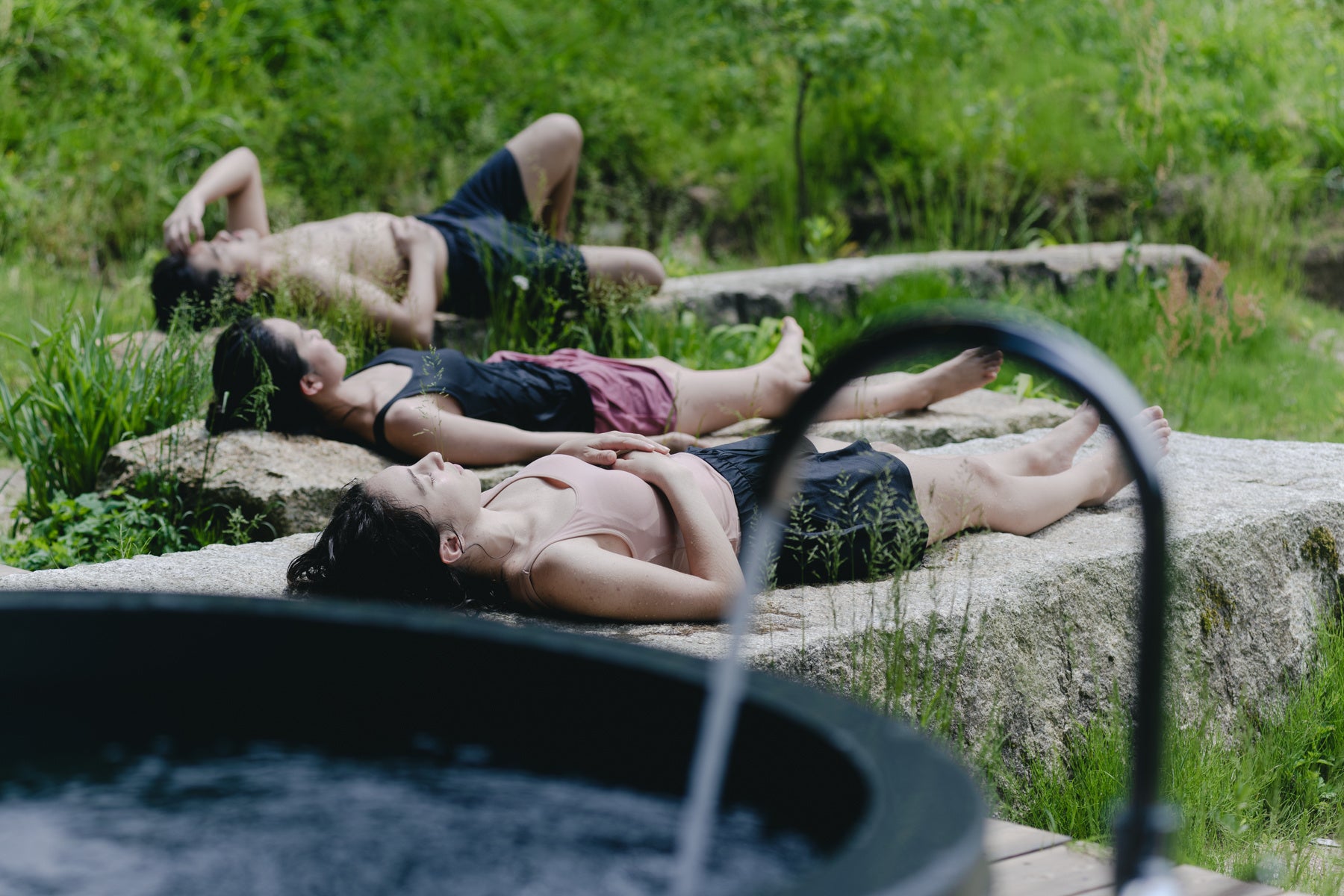 康美青をくり抜いた石風呂で体をじんわり温め、ドカン風呂(水風呂)で、自然と一体となる爽快な冷却が体験できます。すぐ脇の川へ下り、自然の柔らかい流水も体験出来ます。 -