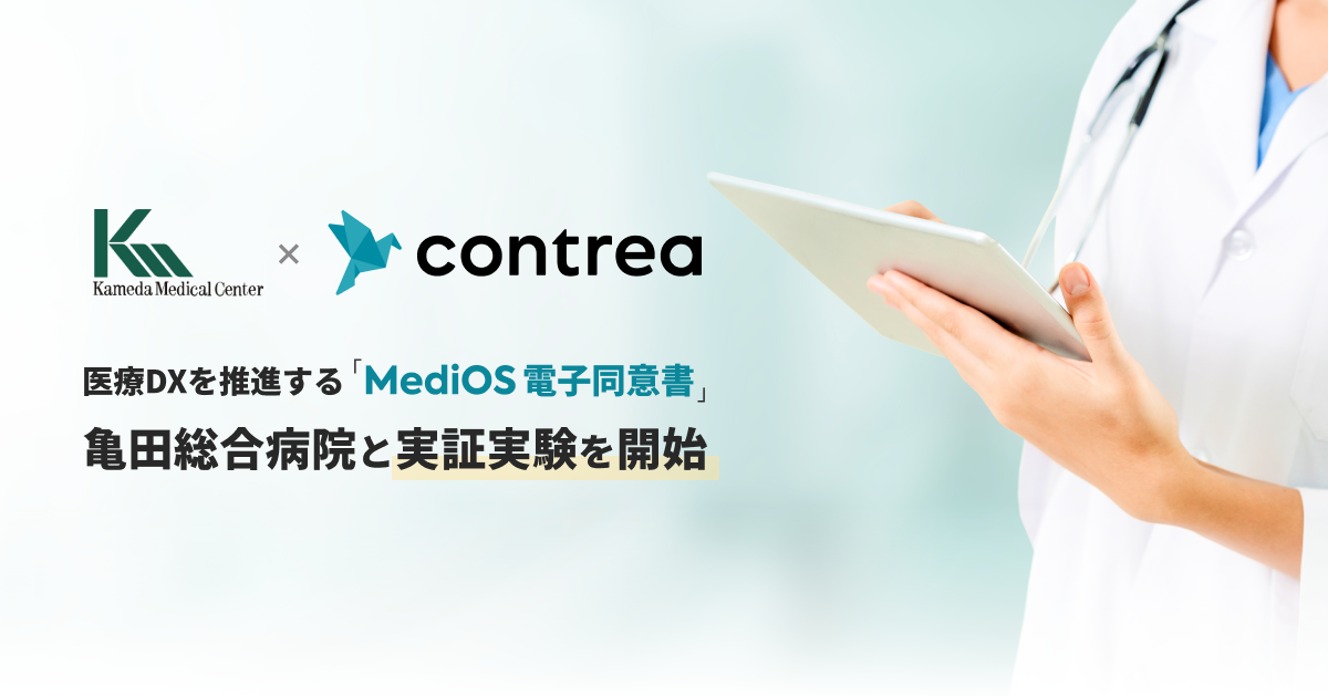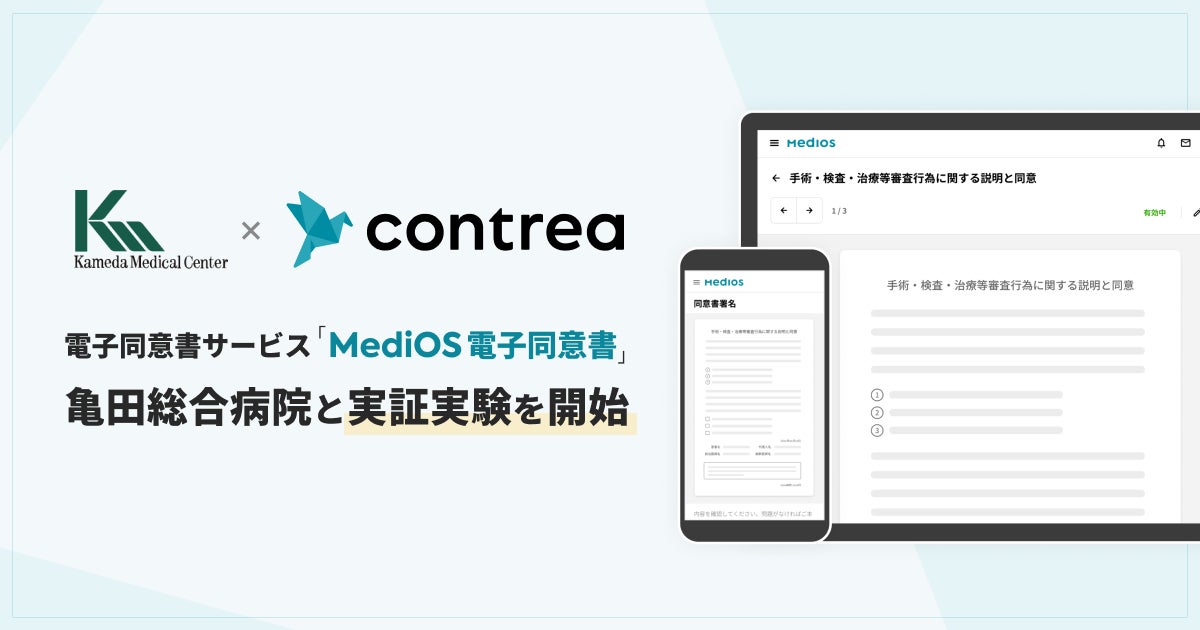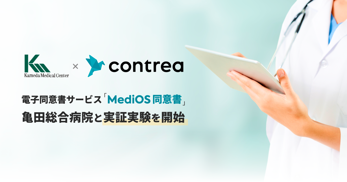 Contrea株式会社(東京都渋谷区、代表取締役:川端一広、以下「当社」)は、医療法人鉄蕉会(千葉県鴨川市、理事長:亀田隆明)の亀田総合病院と「MediOS 電子同意書」の実証実験を開始いたします。また、一般公開に向けて、事前の先行登録を開始します。ご興味のある方は本プレスの下部をご覧ください。