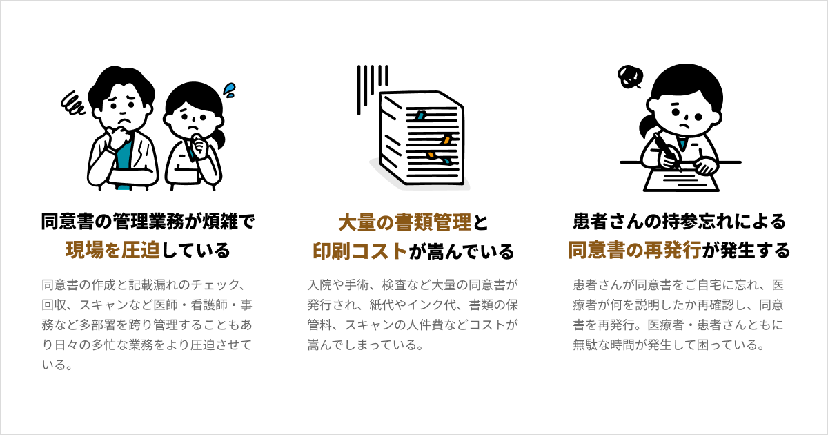 医療現場では手術や入院、検査などあらゆる場面で同意書が必要とされ、膨大な枚数の同意書が発行されています。さらに、患者様から回収した紙の同意書を電子カルテ上で確認しないとならないため、1枚ずつスキャンし電子カルテに保存するなど、非効率な運用が行われています。しかし、このような課題を認識していても、中々改善に取り組めない医療現場も多いのが実態です。