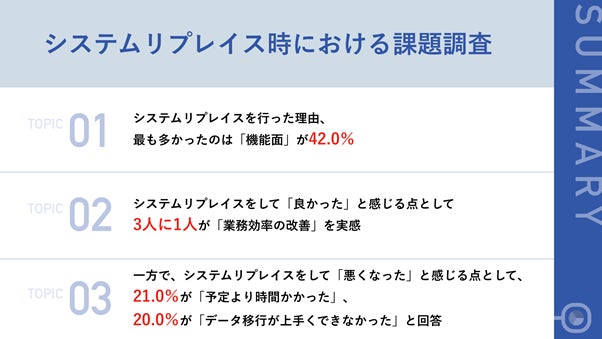 今回の調査では、システムリプレイスをしてみて、業務効率の改善などのメリットがありつつも、移行に時間がかかったなどのシステムのベンダーに対しての不安点も明らかになりました。選ばれるベンダーになるためには、「スムーズなデータ移行」を実現できることが、今後のシステムリプレイス時において重要視されるでしょう。