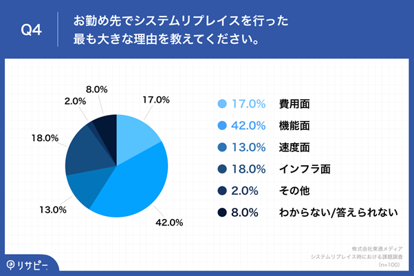 「Q4.お勤め先でシステムリプレイスを行った最も大きな理由を教えてください。」(n=100)と質問したところ、「機能面」が42.0%、「費用面」が17.0%という回答となりました。