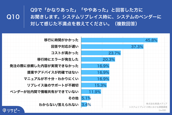 「Q10.Q9で「かなりあった」「ややあった」と回答した方にお聞きします。システムリプレイス時に、システムのベンダーに対して感じた不満点を教えてください。(複数回答)」(n=59)と質問したところ、「移行に時間がかかった」が45.8%、「回答や対応が遅い」が37.3%、「コストが高かった」が23.7%という回答となりました。