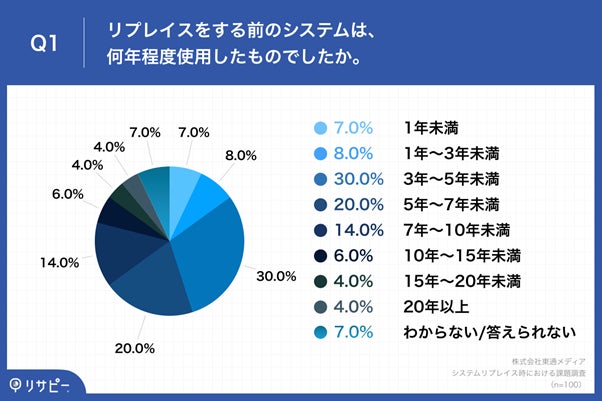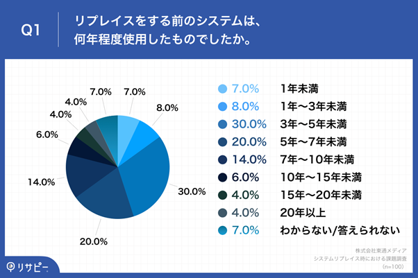 「Q1.リプレイスをする前のシステムは、何年程度使用したものでしたか。」(n=100)と質問したところ、「3年〜5年未満」が30.0%、「5年~7年未満」が20.0%という回答となりました。