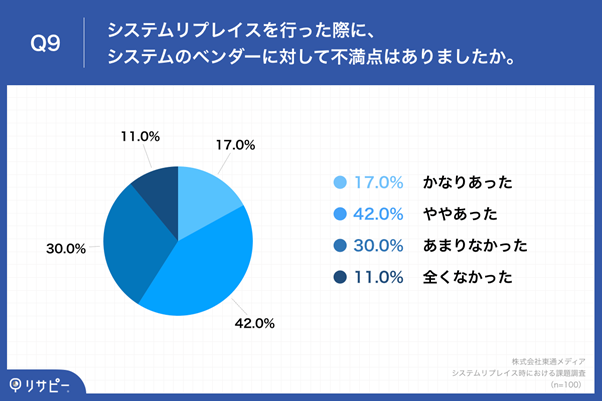 「Q9.システムリプレイスを行った際に、システムのベンダーに対して不満点はありましたか。」(n=100)と質問したところ、「かなりあった」が17.0%、「ややあった」が42.0%という回答となりました。