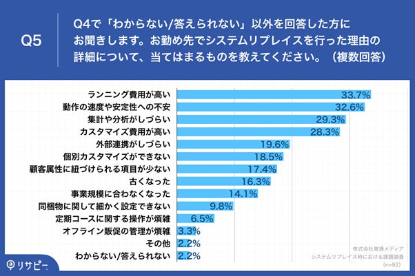 「Q5.Q4で「わからない/答えられない」以外を回答した方にお聞きします。お勤め先でシステムリプレイスを行った理由の詳細について、当てはまるものを教えてください。(複数回答)」(n=92)と質問したところ、「ランニング費用が高い」が33.7%、「動作の速度や安定性への不安」が32.6%、「集計や分析がしづらい」が29.3%という回答となりました。