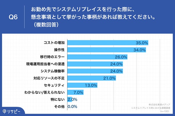 「Q6.お勤め先でシステムリプレイスを行った際に、懸念事項として挙がった事柄があれば教えてください。(複数回答)」(n=100)と質問したところ、「コストの増加」が35.0%、「操作性」が34.0%、「移行時のエラー」が26.0%という回答となりました。