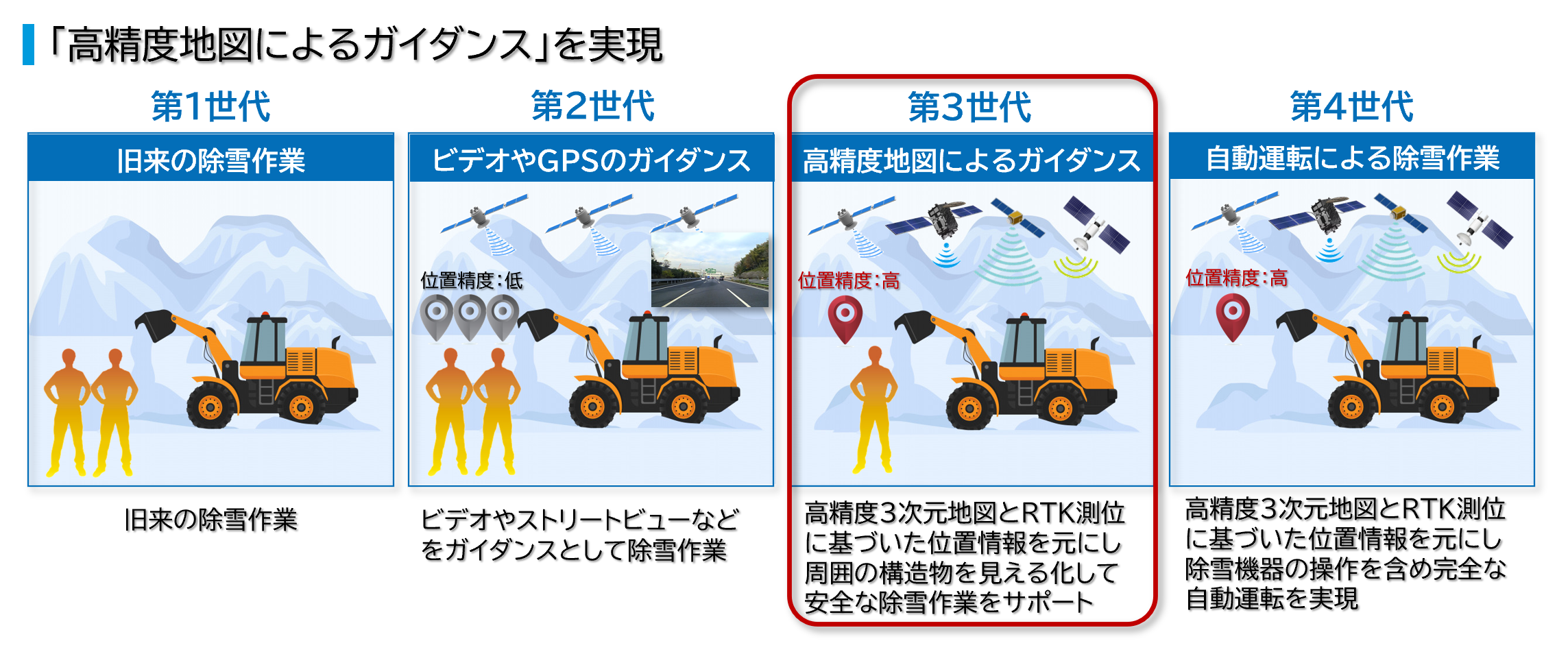 過去、除雪作業は熟練除雪オペレータの知見や経験に頼っていましたが(下図:第1世代)、近年のオペレータの高齢化を受け、ノウハウの伝達にも限界があります。また、近年用いられている夏季のビデオを参考にしたり、位置精度が10mにも及ぶGPS信号を利用した地図サービスや道路沿いの風景を提供するインターネットサービスなどを利用した除雪作業にも限界があります(第2世代)。