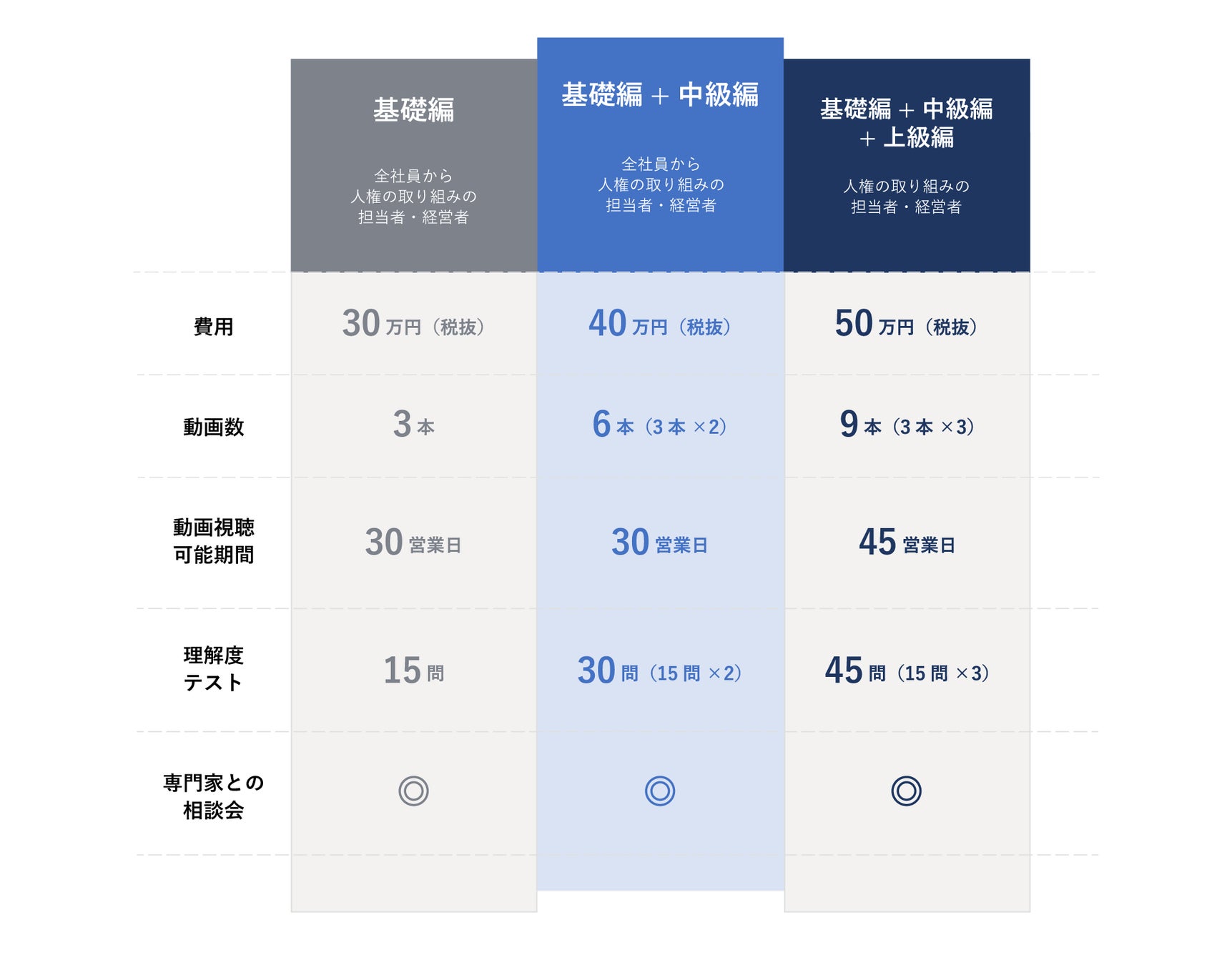 ビジネスと人権eラーニングには、3つのプランがあります。