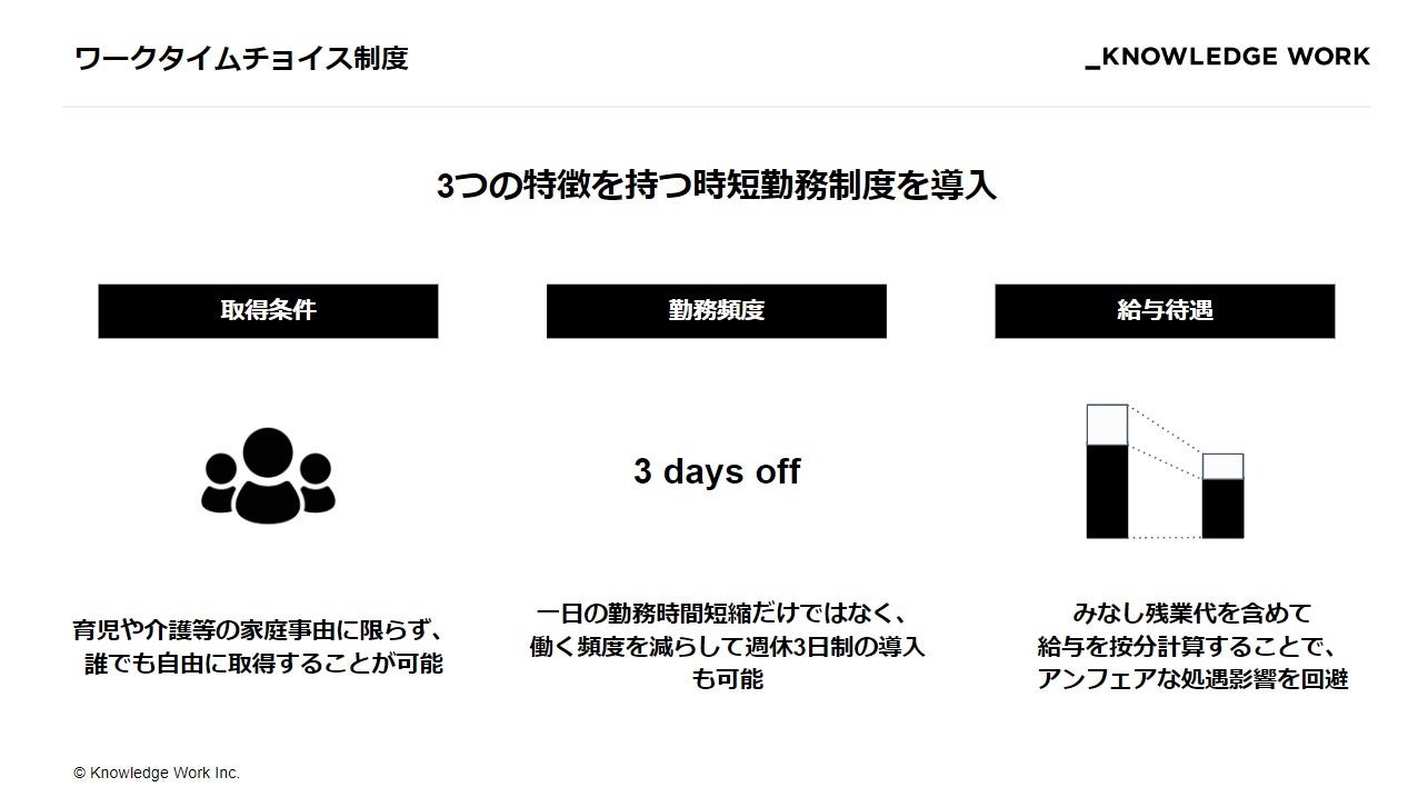 ナレッジワークは、フルタイム勤務での実績に関係なく、多様なワークスタイルが選択出来るように制度を変更致しました。