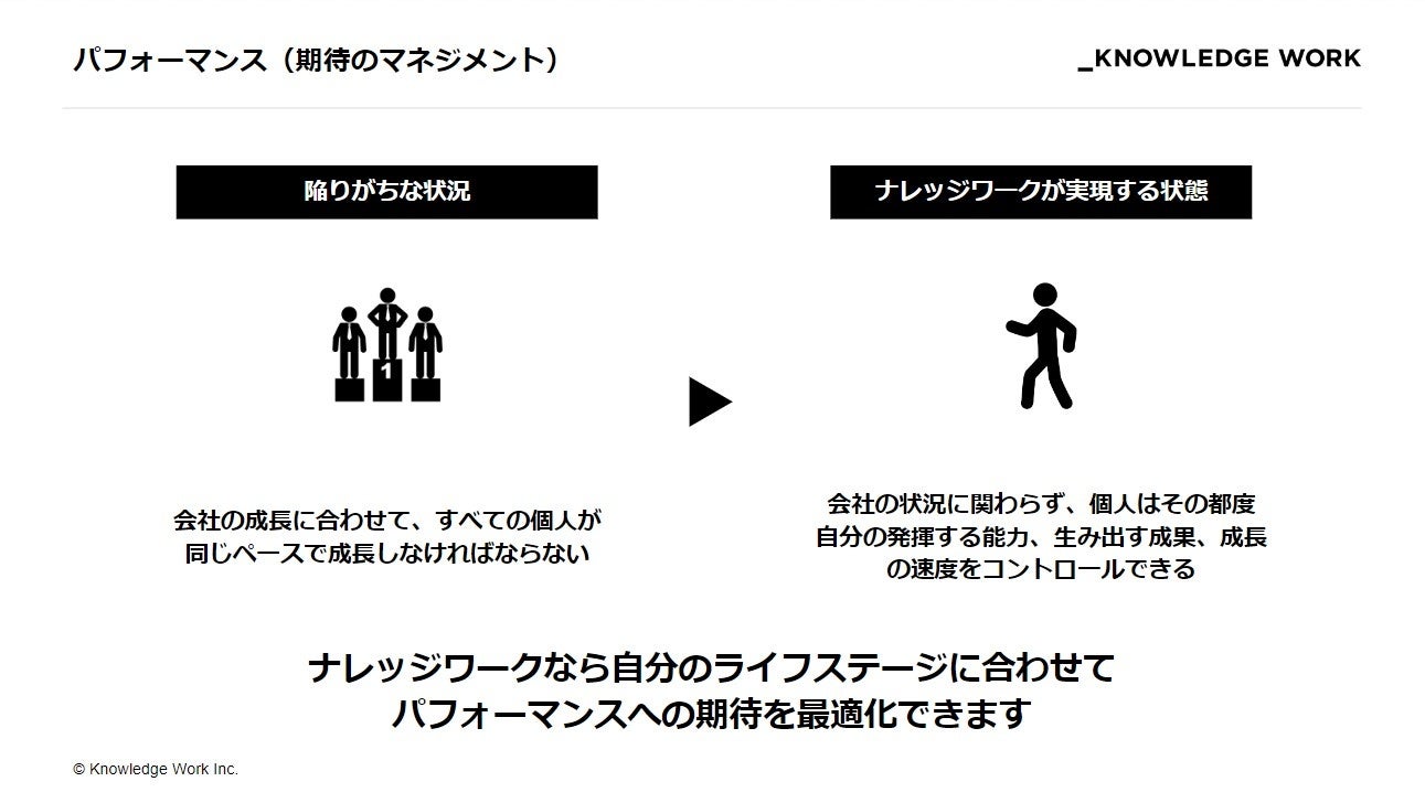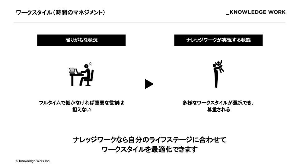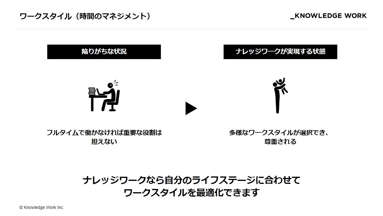 ナレッジワークは、仕事における成長を、自身のライフイベント・ステージに応じて自らの意思でコントロールできるように支援します。