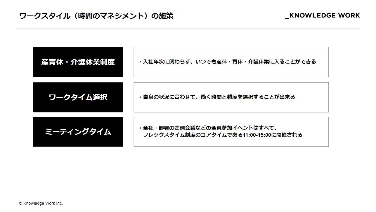 また、多様なワークスタイルが実現出来るように、制度だけではなく社内会議の運用なども改善を進めてまいります。