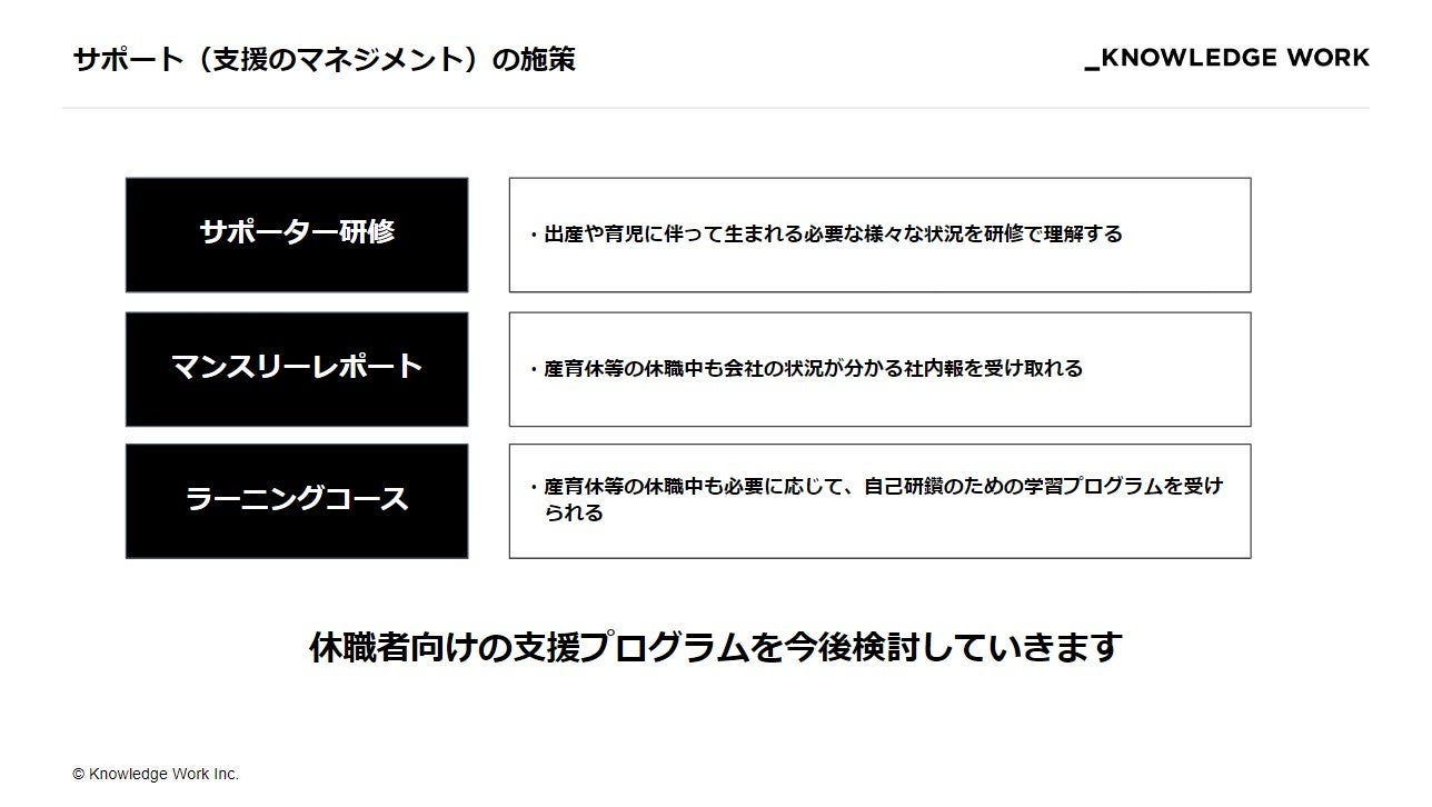 今後、ライフイベントを迎えたメンバーの同僚への研修や、産育休・介護休業中メンバー向けの支援プログラムを整備していく予定です。