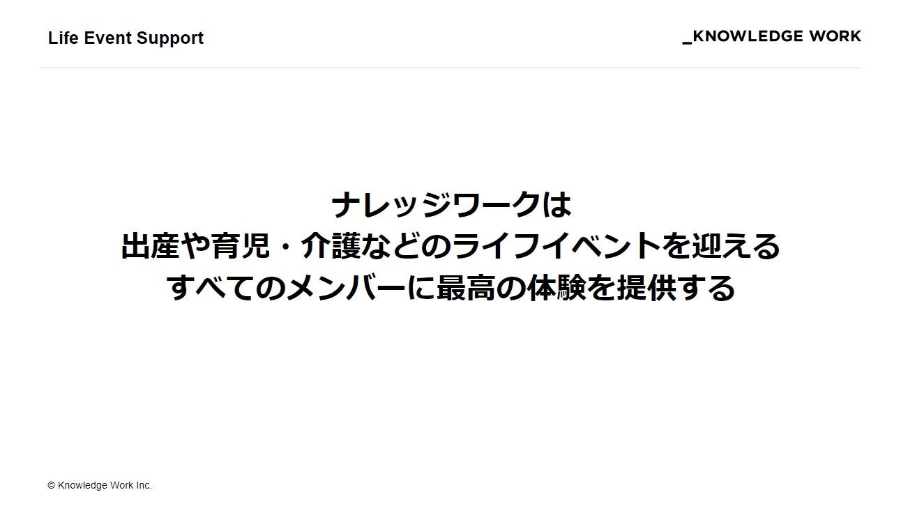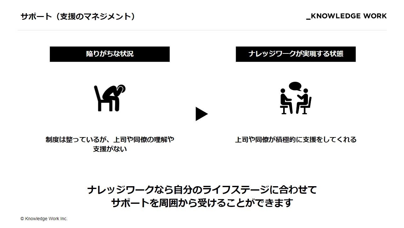 ナレッジワークは、上司や同僚への働きかけにより、ライフイベントを迎えたメンバー自身が孤立せずに支援を受けることが出来る環境を用意してまいります。