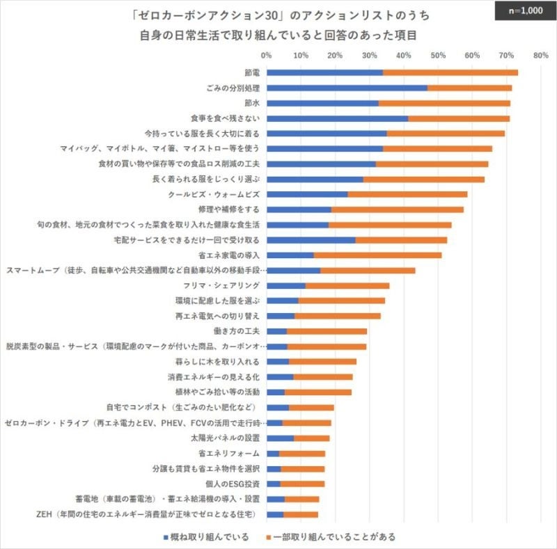 続いて、国・地方脱炭素現実会議が、2021年6月に取りまとめた「地域脱炭素ロードマップ」の中で、日常生活における脱炭素行動として整理、紹介している「ゼロカーボンアクション30」のアクションリストに関して、「自身の日常生活での取り組み状況」を聞く質問を行った。