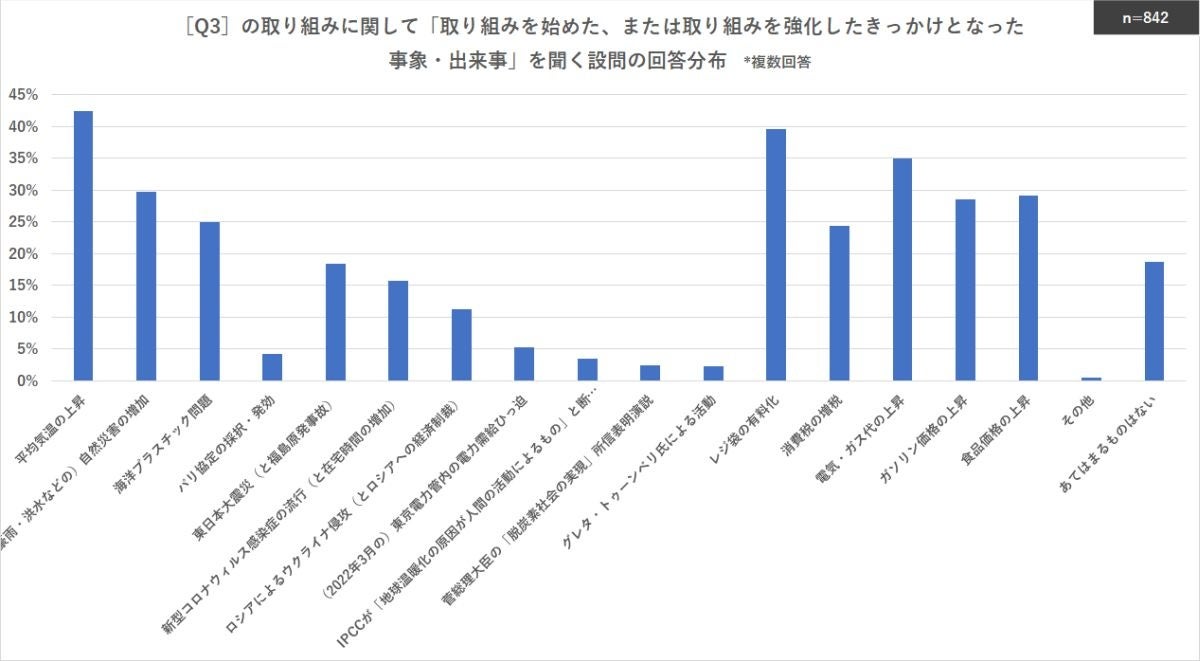 さらに、前問で1項目でも「取り組んでいる」(「概ね取り組んでいる」「一部取り組んでいることがある」のいずれか)を選択した人に対して、「取り組みを始めた(取り組みを強化した)きっかけとなった事象・出来事があったか?」を例示して聞いたところ、「平均気温の上昇(42.5%)」が最多の回答となり、続いて「レジ袋の有料化(39.5%)」、「電気・ガス代の上昇(34.9%)」となった。