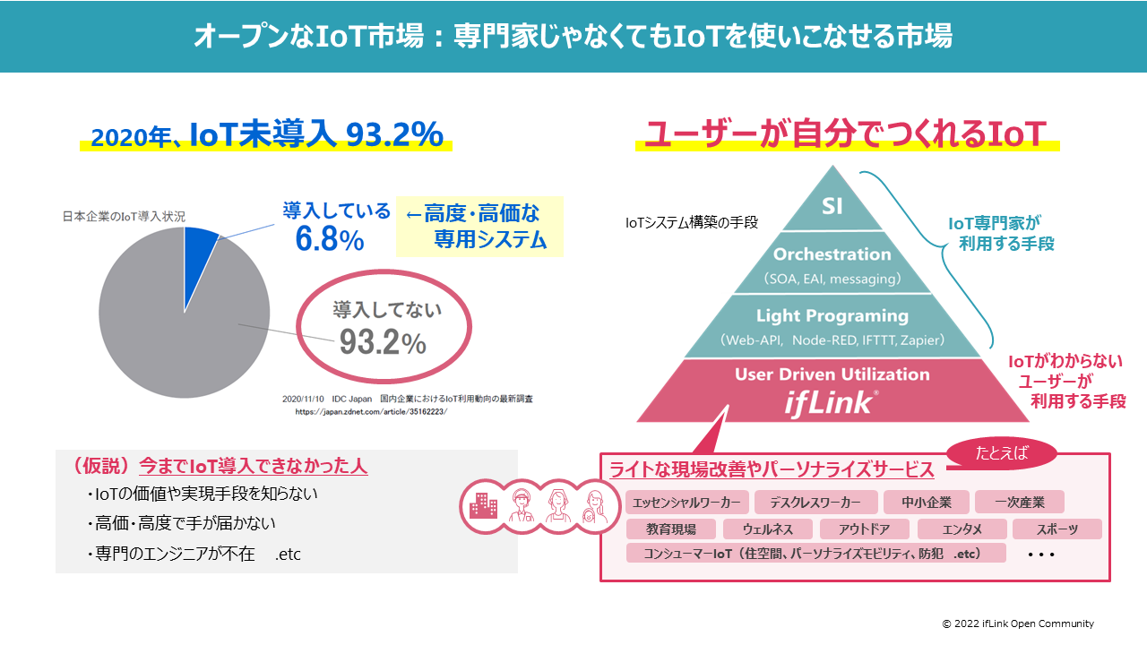 理事 千葉恭平からは、共創型IoTプラットフォーム「ifLink」とコミュニティのコアバリューを「出会いの場」「試行の場」「起業の場」×「標準IMSモジュール」「オープンレシピ」の“ツーバイスリーのコアバリュー”と再定義し、専門家でなくてもIoTを使いこなせる「オープンなIoT市場」開拓を開始することを発表しました。