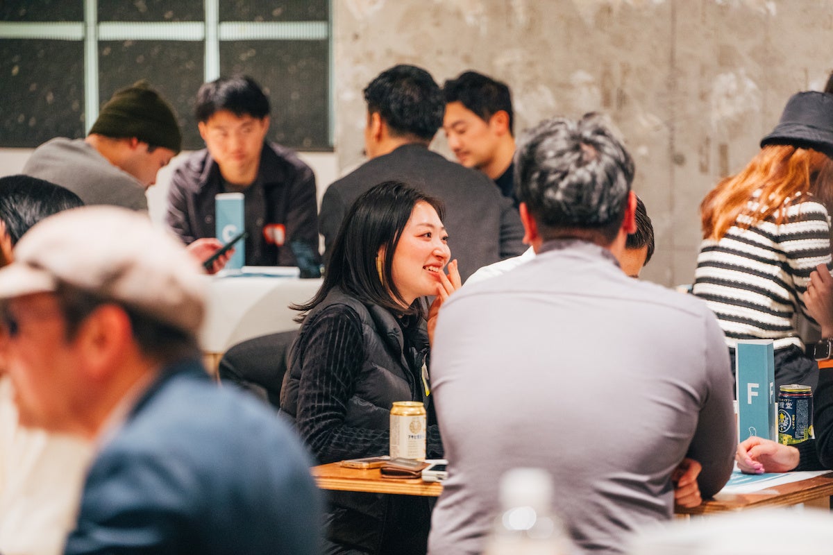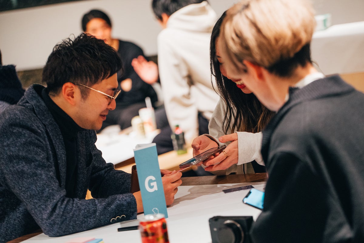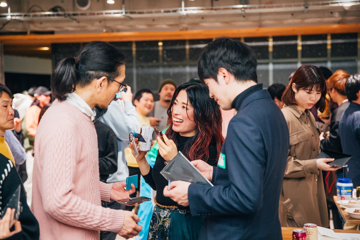 最後に、プレーリーカードユーザー100人の皆さまと交流会をしました。紙の名刺ではなく、プレーリーカードをかざしあって自己紹介。カードのデザインや人となりや仕事、趣味が伝わるプロフィールページをもとに、初めての出会いでもお話がとても盛り上がりました。