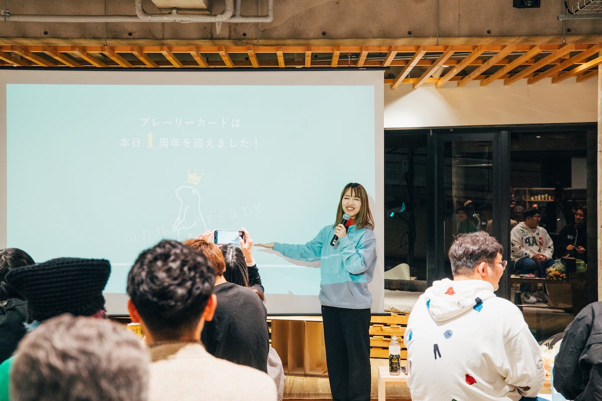 まずは共同代表の坂木茜音より、皆さまにご挨拶と1周年の感謝の言葉をお伝えしました。「今日でプレーリーカード1周年を迎えました。おかげさまでプレーリーカードの利用回数は累計20万回を超えました。ここにいる皆さま一人ひとりが使ってくれたおかげで辿り着けたと思っています。今日は私たちから感謝をお伝えする日であるとともに、ユーザーさん同士の出会いの日として楽しくプレーリーカードの交換をしていただけると嬉しいです」
