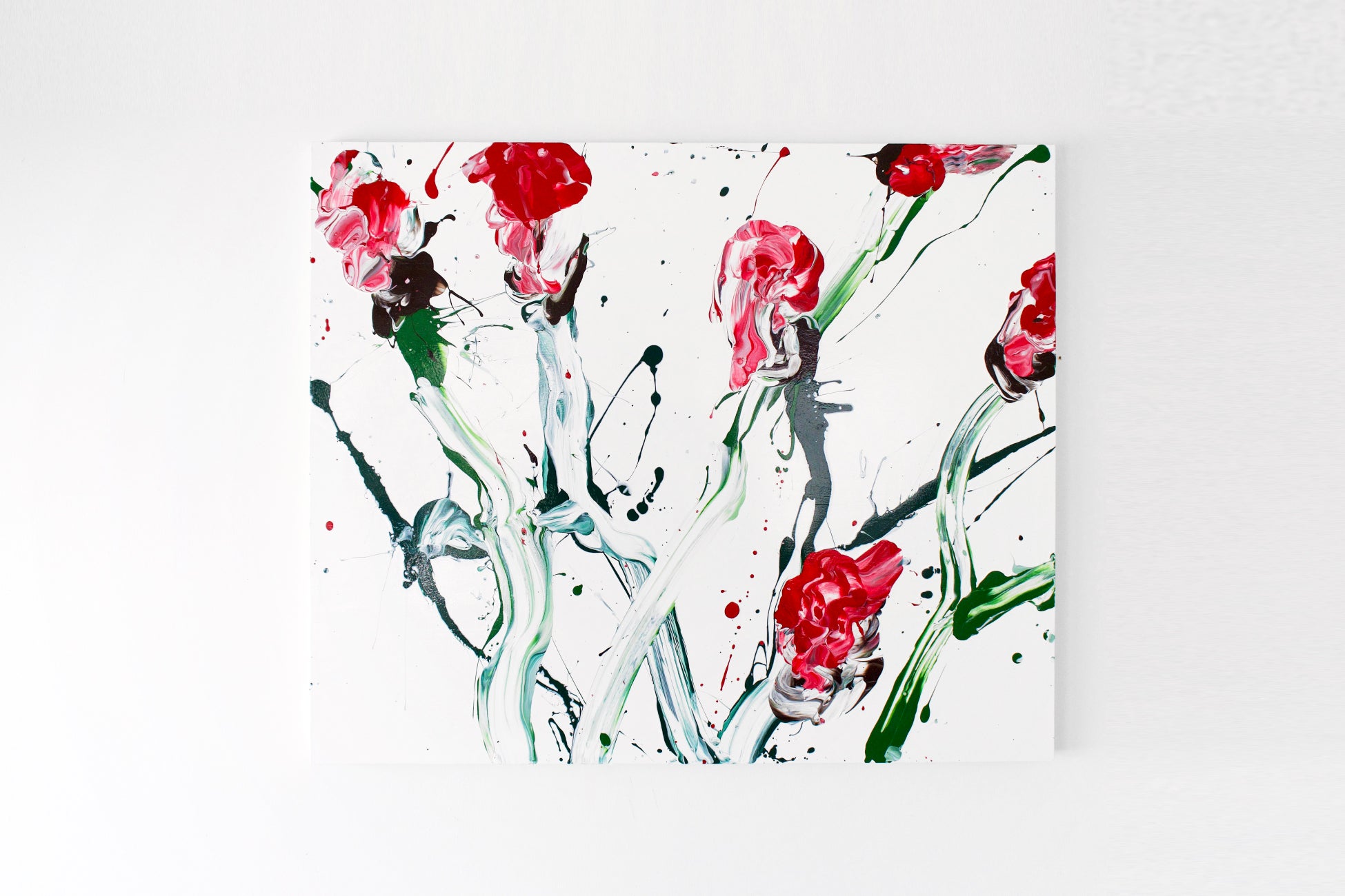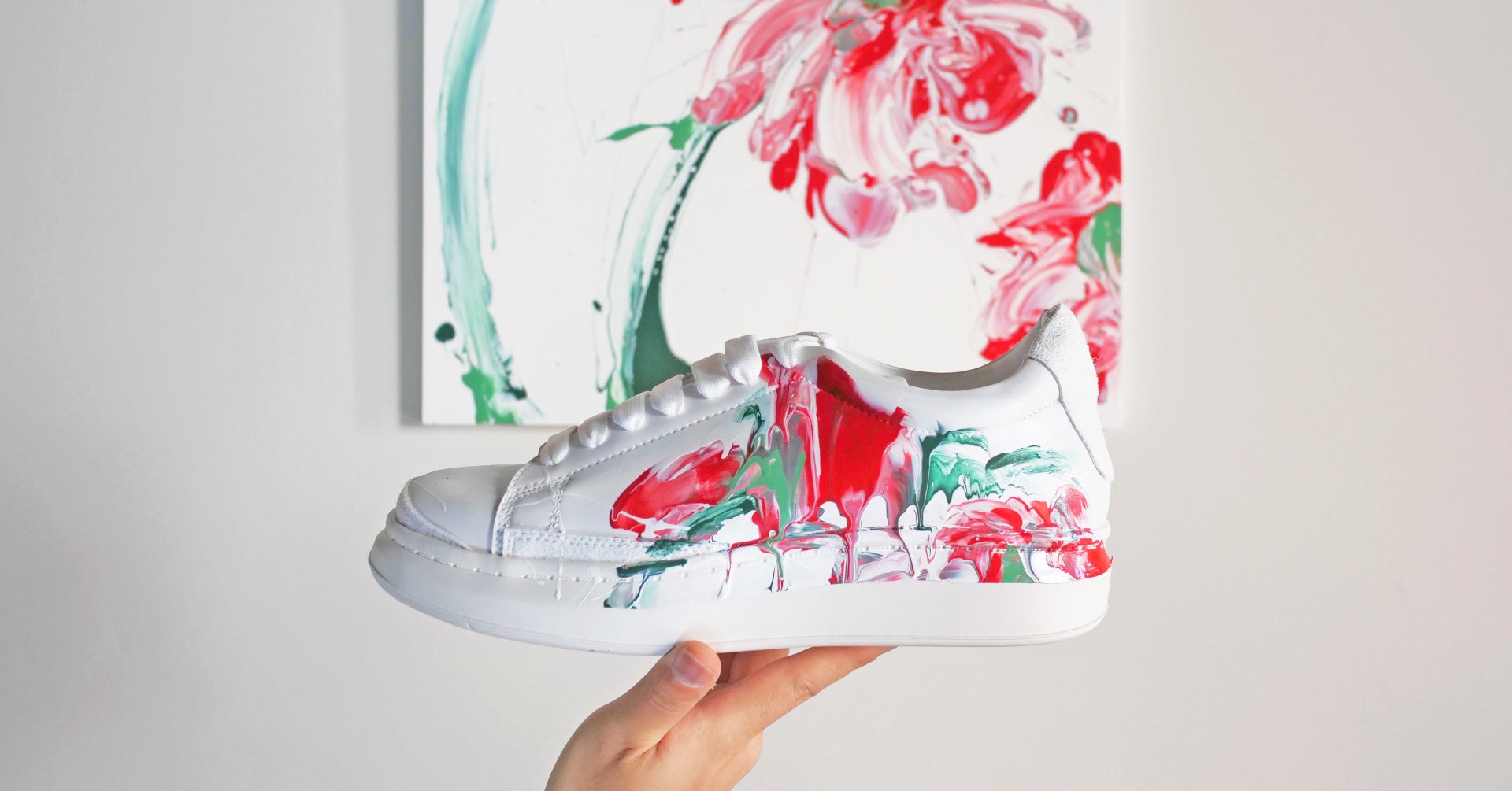 今回は、GO WITH WHITEの「POLAR」に、赤いガーベラの花を描いたデザインスニーカーを制作。白い余白を残した描き方は、普段描いている絵の作風でもあり、絵がそのままスニーカーに落とし込まれているのが特徴になっています。一点一点直接スニーカーに描いている作り方となっているため同じ絵はなく、個々の違いを楽しんでいただけるアイテムです。