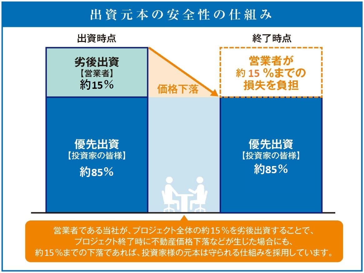 1口10万円から各地の不動産への投資が可能となっており、優先劣後出資システム(劣後出資割合 15%)を採用することで投資家の毀損リスクも低い不動産投資です。