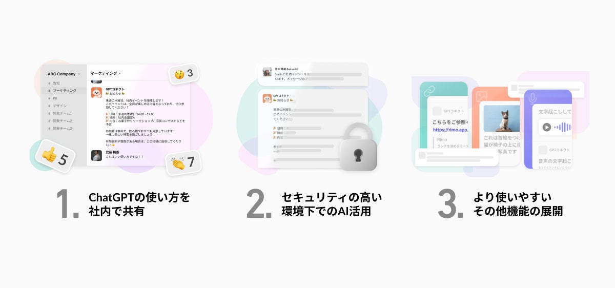 Rimoはこれまでも、自社が提供するAI文字起こし/議事録サービス「Rimo Voice」にてChatGPTを活用した機能追加を行う等、ChatGPTのリリース当初からその技術の活用に努めてまいりました。現在各企業にて、ChatGPTに関心はあってもセキュリティや工数の問題で導入が進まない事例が多くある状況から、そのような課題を解決するためのツールとして「GPTコネクト」を開発、提供するに至りました。