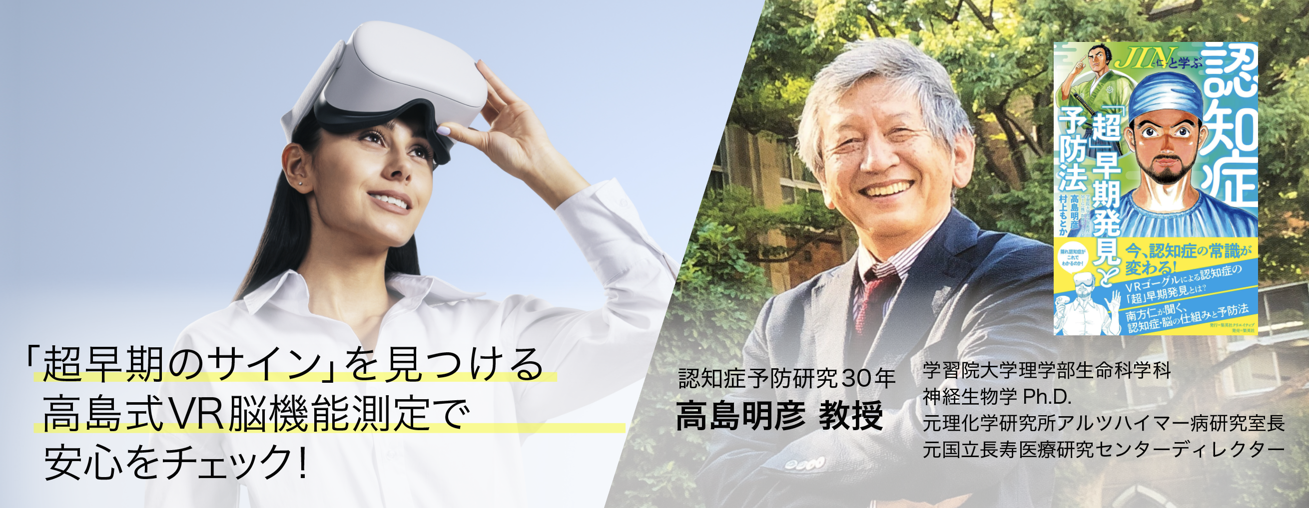 アルツハイマー病は脳神経破壊が始まってから20-30年かけて発症へ。破壊された神経は戻りませんがその前なら改善は可能。「治療法がないのに検査しても仕方ない、怖いから受けない」という声が多く聞かれますが、破壊の兆候・超早期のサイン段階では予防効果が期待できます。50代の約半数で見つかる超早期の危険サイン。予防研究30年以上の高島教授が本VRを開発しました。