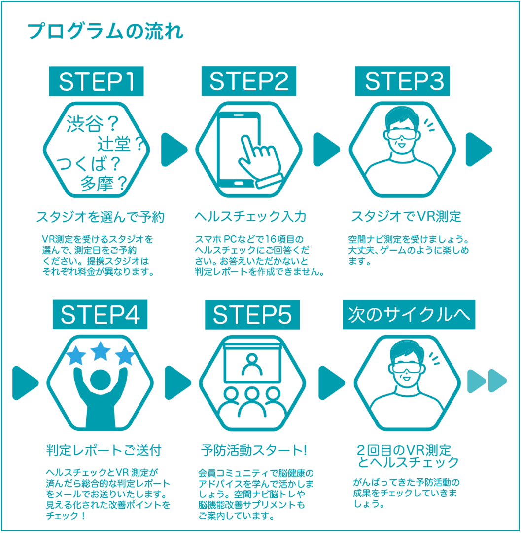 Brain100 studioプログラムではまずVRゴーグルでの空間ナビ測定と、WHOが定めた発症リスク因子などのヘルスチェックに回答いただくと脳健康レポートをお出しします。