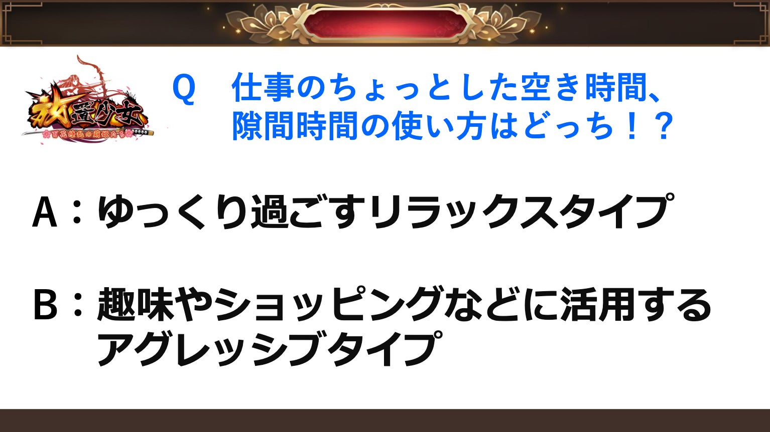 『放置少女』は放置したままでもレベルが上がっていくゲームなので、仕事の休憩などのちょっとした隙間時間で遊べるのが特徴。そこで、今田さんには仕事の合間の空き時間はどのようにして過ごすことが多いのか問いかけたところ、趣味やショッピングに費やされるとのことでした。休日は基本的に家で過ごすことが好きなため、出来れば外にいる間に外で出来る用事を済ませておきたいそうです。