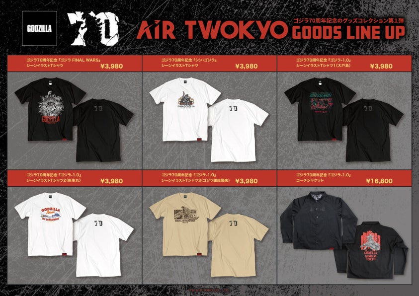 作品は70周年記念作品として公開され、全世界にゴジラ旋風を巻き起こした『ゴジラ-1.0』、庵野秀明氏が監督を起用し、現代日本に現れたゴジラのストーリーが話題となった『シン・ゴジラ』、世界各地に怪獣たちが出現し、ゴジラと対峙する『ゴジラ FINAL WARS』の三作品。これらの作品をAIR TWOKYOオリジナルのデザインでアイテム化しました。