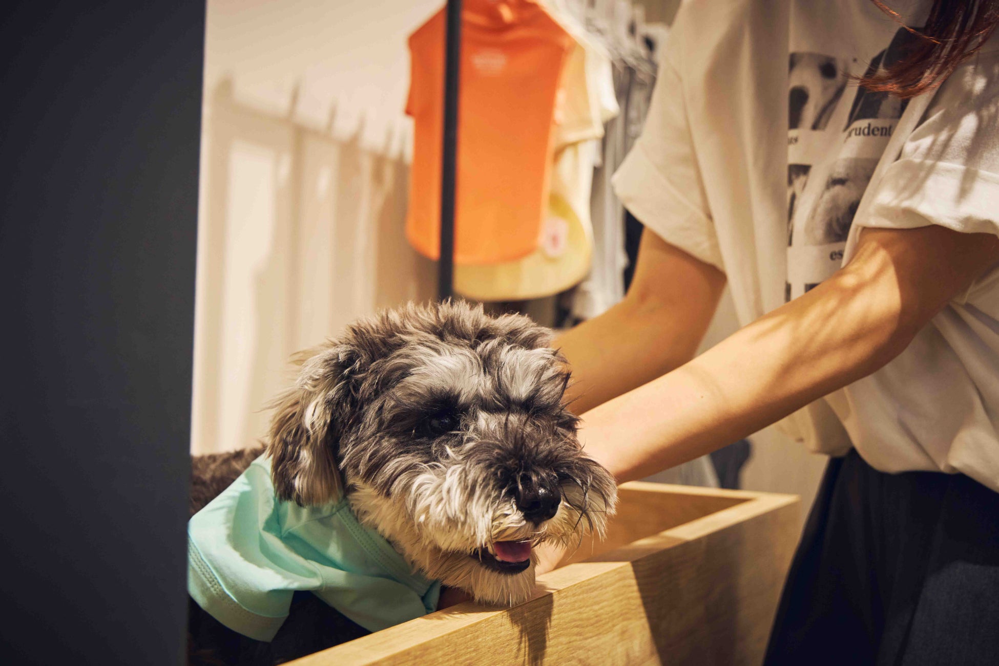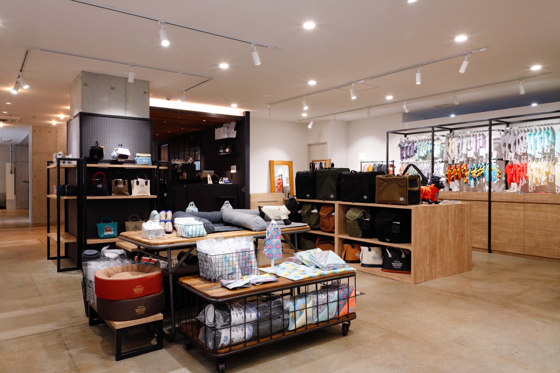 SHOPエリアでは、MANDARINE BROTHERSの新作ウェアはもちろん、人気のキャリーバッグやスリング等、全ラインナップを取り揃えております。実際にグッズを手に取りながら、ペットと一緒にお買い物を楽しんでいただけます。