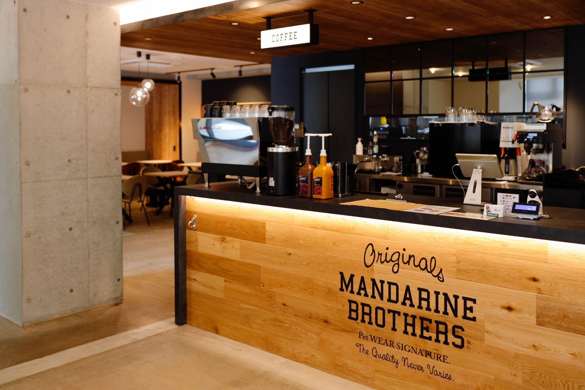 MANDARINE BROTHERSのウェアやグッズを実際に手に取っていただける場所を増やしたいという想いで、直営店という枠にとらわれず、ペットフレンドリーなカフェとして、ワンちゃんやネコちゃん、ペット連れのオーナー様がくつろげる場所づくりを目指しております。