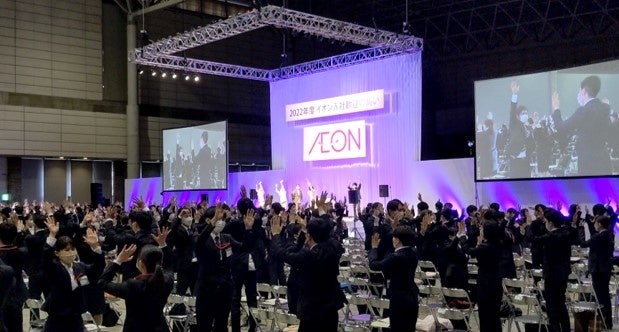 音楽座ミュージカル(東京都千代田区、代表・相川タロー)と株式会社日本マンパワー(東京都千代田区、代表取締役・片山 繁載)は、この度、イオングループの2022年合同入社式となる「イオン 入社歓迎の集い」の中で、約3,400名の新入社員がグループの一体感を味わう「ONE AEON」の演出・進行をサポートしました。同社の入社歓迎の集いは、2020年・2021年と2年にわたり、コロナ禍の影響からオンラインにて開催されていました。そのような状況下で、2022年はITとシアターラーニング(※)のメソッドを駆使してハイブリッド型(新入社員が7エリアの会場に集まり、エリア間をネットワーク回線でつなぐ)で開催しました。