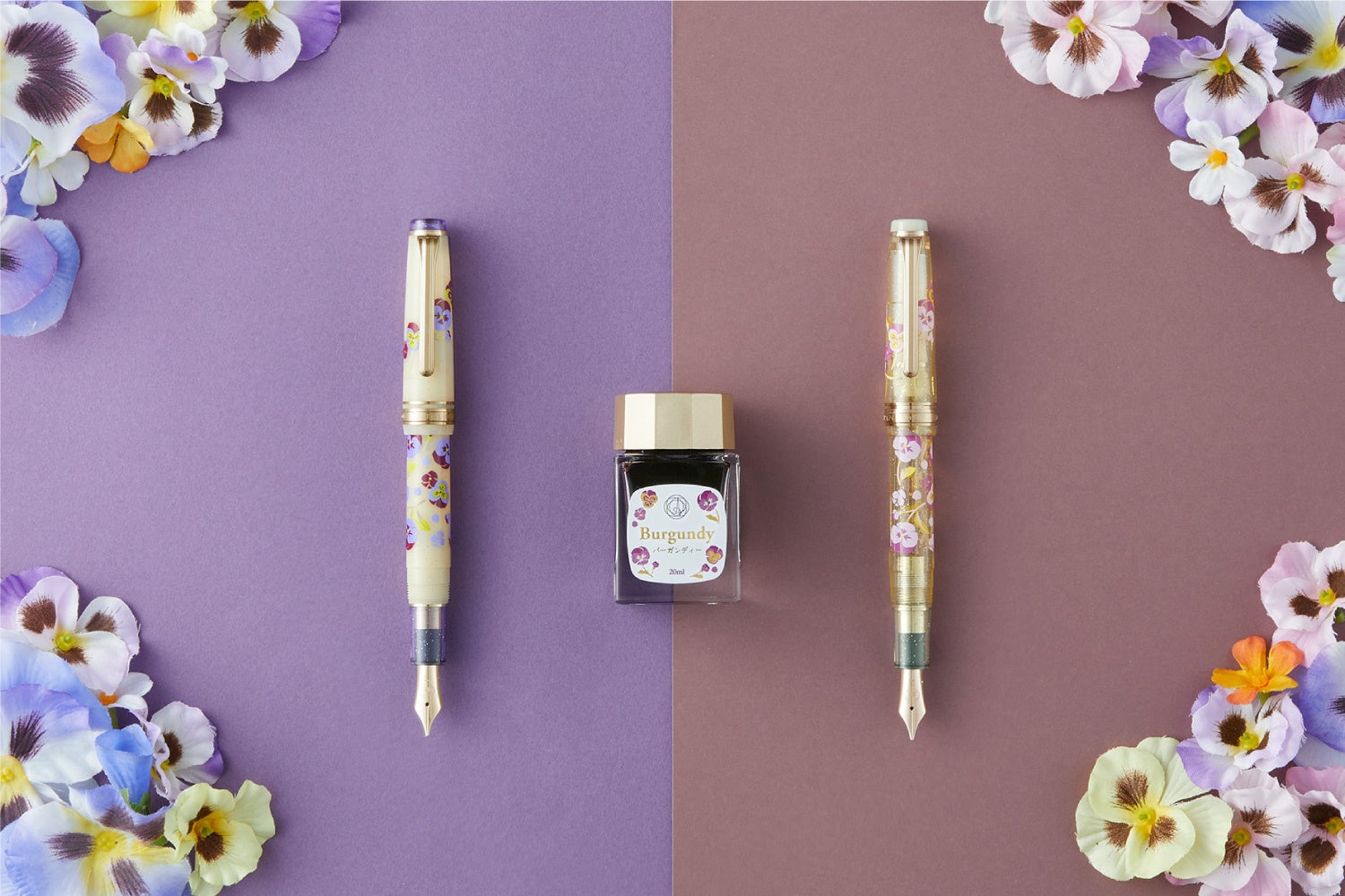 ペン先と蓋栓にはパンジーをモチーフにした装飾を施し、女性の手にしっくりとなじむスリムな本体は、クリアとアイボリーの2色をご用意しました。新たに調色した限定カラー「バーガンディー」のインクがセットされ、字幅は極細字(EF)からミュージック(MS)までの7種類からお選びいただけます。あなたらしさを文字に咲かせ、心をつなぐ。格別な書き味を、特別なデザインでお楽しみください。