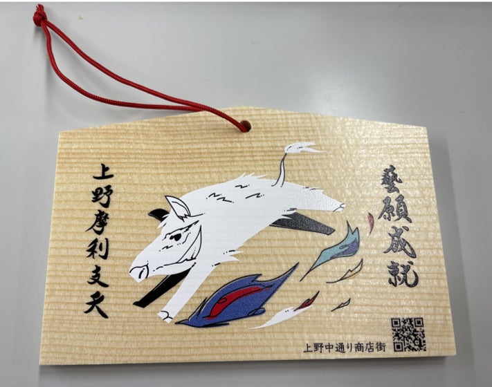 上野中通り商店街に鎮座する摩利支天徳大寺には、十二支の亥(猪)がお仕えしている事から、猪を藝大生が描きおろし!摩利支天は開運勝利の守護神を言われていますが、実は「芸能、芸術の上達」にもご利益があります。「藝願成就」の想いを込め、ご祈祷したオリジナル絵馬で合格祈願をしよう!