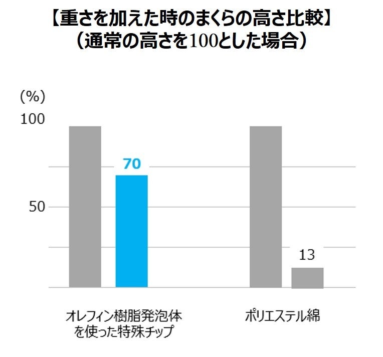 右図のように、同体積の「ポリエステル綿まくら」と「オレフィン樹脂発泡体を使った特殊チップのまくら」を用いて、通常の高さと、頭を乗せた状態の高さ※2を比較しました。通常の高さを100とした場合、頭を乗せた状態になると「ポリエステル綿まくら」が約1割の高さになってしまった一方で、「オレフィン樹脂発泡体を使った特殊チップのまくら」は約7割の高さを維持しています。