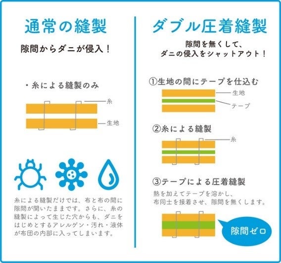 糸による縫製に加え、生地の間に特殊なテープを挟み、熱で溶着することで密閉する「ダブル圧着縫製」で仕上げています。そのため、通常の縫製で発生する針の穴や縫製部分の隙間が無くなり、ダニの生体やフン、死骸、花粉や汗などの汚れが寝具の内部への侵入することを防ぎます。